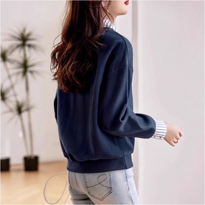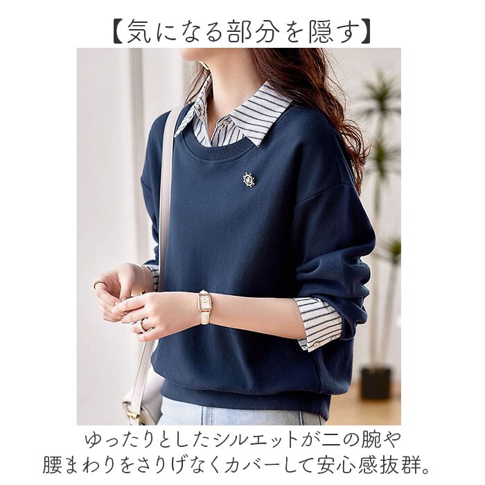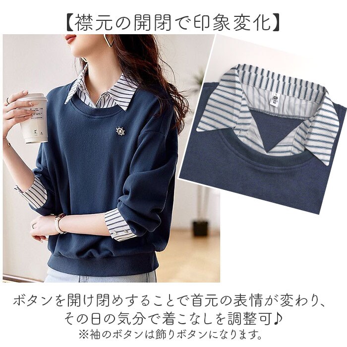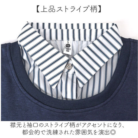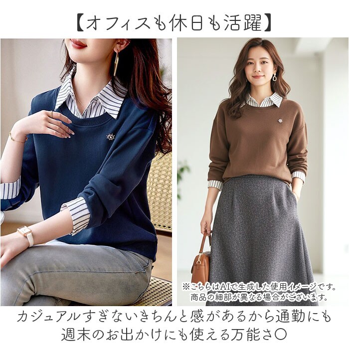 | 商品説明 | 【一枚で完成スタイル】レイヤード風デザインで朝の着こなしがラクに決まる優秀トップス。【コーデ要らずの時短】シャツとニットを重ね着したような一枚二役デザインで朝の支度がスムーズに完成♪【気になる部分を隠す】ゆったりとしたシルエットが二の腕や腰まわりをさりげなくカバーして安心感抜群。【上品ストライプ柄】襟元と袖口のストライプ柄がアクセントになり、都会的で洗練された雰囲気を演出◎【襟元の開閉で印象変化】ボタンを開け閉めすることで首元の表情が変わり、その日の気分で着こなしを調整可♪※袖のボタンは飾りボタンになります。【取り外せるブローチ】舵輪モチーフのブローチは取り外しができるから、シンプルな着こなしにも対応可能!【オフィスも休日も活躍】カジュアルすぎないきちんと感があるから通勤にも週末のお出かけにも使える万能さ〇 |