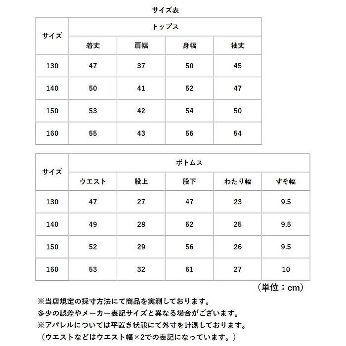 | サイズ | [キッズ] ・130cm(身長110-120cm推奨) ・140cm(120-130cm推奨) ・150cm(130-140cm推奨) ・160cm(140-150cm推奨) ※サイズについて詳細は、商品画像の中にあるサイズ表をご覧くださいませ。 ※丈感が短いので推奨サイズをご参照ください。 |