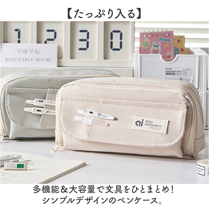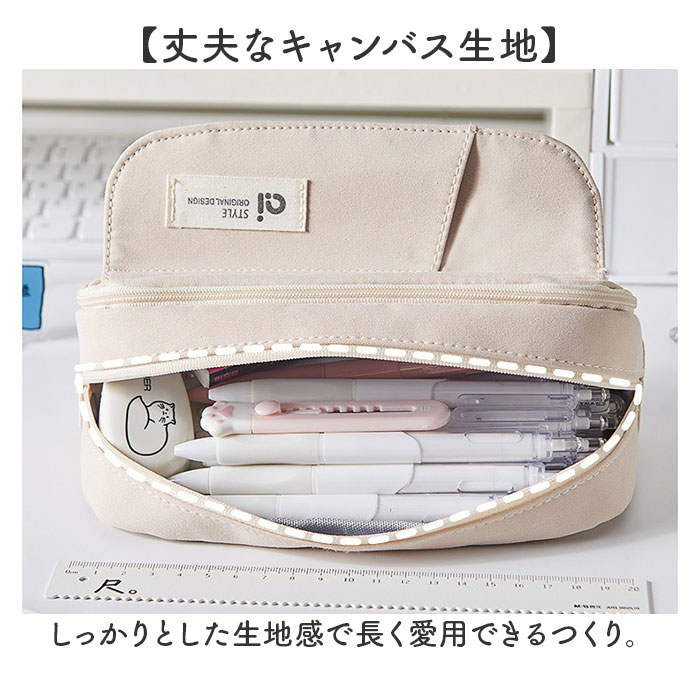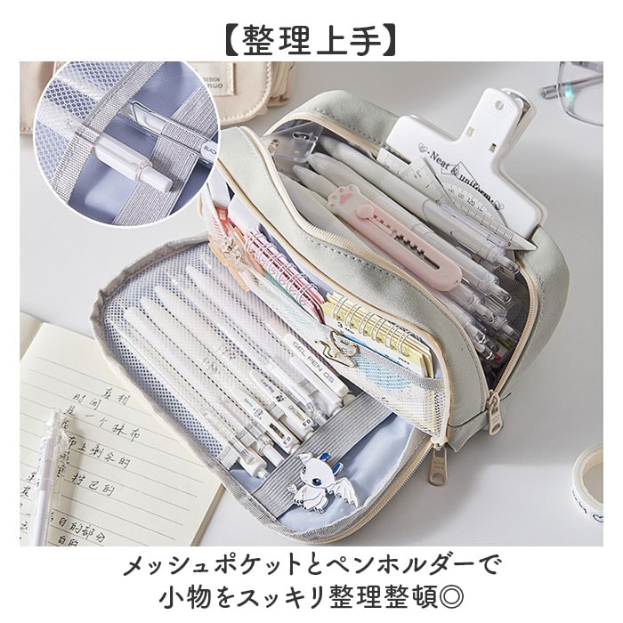 | 商品説明 | 【たっぷり入る】多機能&大容量で文具をひとまとめ!シンプルデザインのペンケース。【たっぷり入る2ルーム】ペンや消しゴムなど必要な文房具をひとまとめ♪【整理上手】メッシュポケットとペンホルダーで小物をスッキリ整理整頓◎【便利な外ポケット】外側のポケットにも収納可能で使い勝手抜群!【丈夫なキャンバス生地】しっかりとした生地感で長く愛用できるつくり。【ポーチとしても活躍】ペンケースはもちろん、メイク道具などを入れるポーチとしても使える。 |