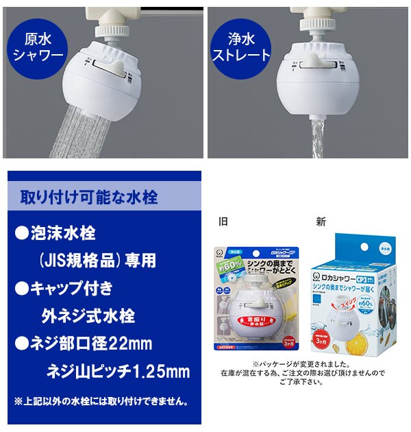 | 注意点 | 【取り付け可能な水栓】丸型で先端にふくらみのある口径16mmの水栓 16mm用リングをお使いください。泡沫水栓(キャップ付外ネジ型水栓でネジ部口径22mmピッチ1.25のみ可能です)泡沫水栓用リング(泡沫水栓用)をお使いください。ヤンマー、グローエ社製等の水栓の場合は別売のリングが必要です。【付属のアタッチメントでは取り付けできない水栓】下記のような水栓の場合、別売品のリングを必要とします。(1)丸型で先端にふくらみのない水栓(2)角型・特殊なデザイン・泡沫キャップ付角ネジ型の水栓(3)ヤンマー・モーエン・グローエ(ネジピッチ1.0)社製などの泡沫水栓(4)グローエ・KVK社製で内ネジ式泡沫水栓(5)丸型で先端にふくらみのある口径17.5mm・19mmの水栓【取り付けられない水栓】外ネジ式泡沫水栓でネジ部口径が23mm以上のものモーエン社製内ネジ式泡沫水栓カメラやモニターの性質により、画像と実物の色の違いがある場合がございますのでご理解願います。 |