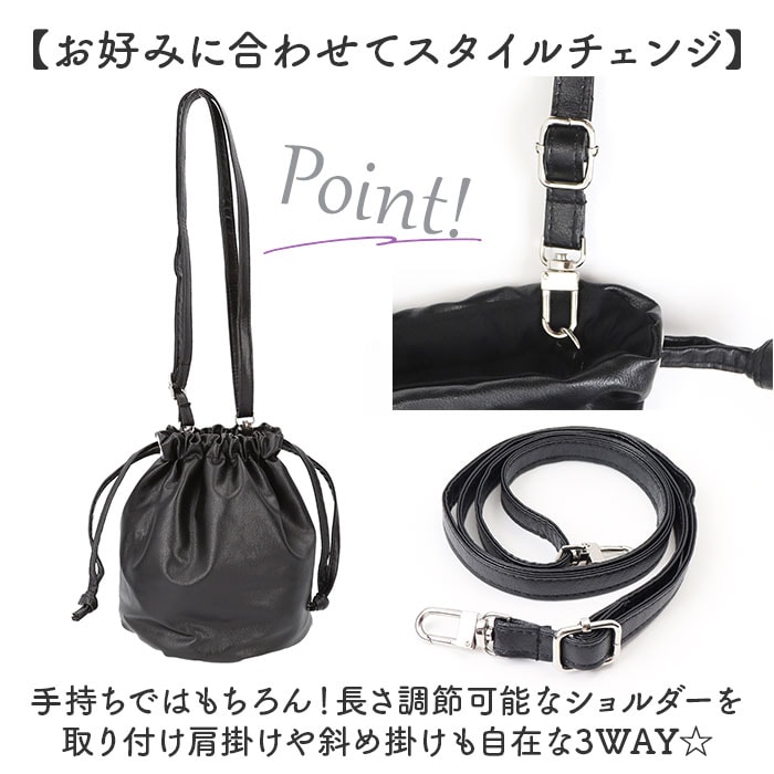| 商品説明 | 【ミニマルスタイルにおすすめ】これ1つで身軽にお出かけ♪「Rename ソフトフェイクレザー巾着バッグ」が新登場。【シンプルですっきりとした仕上がり】柔らかなフェイクレザーを採用。無駄を省いたスタイリッシュなデザインで、コーデを選ばない!【軽やかな使い心地でヘビロテ☆】ころんとしたフォルムがキュート♪サッと持ち出せて、体に負担をかけない軽量設計。【お好みに合わせてスタイルチェンジ】手持ちではもちろん!長さ調節可能なショルダーを取り付け肩掛けや斜め掛けも自在な3WAY☆【キュッと絞って開閉がスムーズ】開閉に手間取らない巾着タイプ。開口部を絞れば、中身の飛び出しもガード。【マストアイテムをひとまとめ】ミニ財布やハンカチ、エチケットグッズなどをIN。350mlペットボトルも収納可能。【お気に入りを選べるカラー】ベーシックと、ワンポイントになるカラーをラインナップ。飽きが来ず長く使えるアイテム。 |