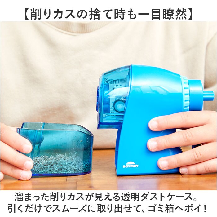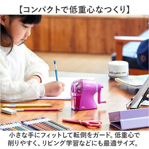 | 商品説明 | 【安全面に配慮し、手軽に使える◎】お子さまに最適な安全設計。使い勝手もばっちりな「手動鉛筆削り ケズルトン」。【鉛筆を差し込むだけの簡単操作】鉛筆を差し込みハンドルを回すだけ。指を挟む心配がなく、お子さま1人でラクラク鉛筆削り!【3段階の芯先調節で色んな形状に】六角・三角・円形の鉛筆や色鉛筆を削れる仕様。鉛筆に合わせた削り方をチョイス。【便利なムダ削り防止機能付き】ハンドルが軽くなると、削り上がりのサイン♪ムダ削りを抑えられる嬉しい機能!(※)ハンドルを逆回転させると、鉛筆を送り出します。【芯詰まり除去機能でサクッと対応】芯が折れて詰まってしまっても慌てない♪ダイヤルを押して、取り除くことが可能。【コンパクトで低重心なつくり】小さな手にフィットして転倒をガード。低重心で削りやすく、リビング学習などにも最適サイズ。【削りカスの捨て時も一目瞭然】溜まった削りカスが見える透明ダストケース。引くだけでスムーズに取り出せて、ゴミ箱へポイ!【お気に入りを選べるカラー】男の子も女の子も使えるカラーをラインナップ。長く愛用できるシンプルデザイン。 |