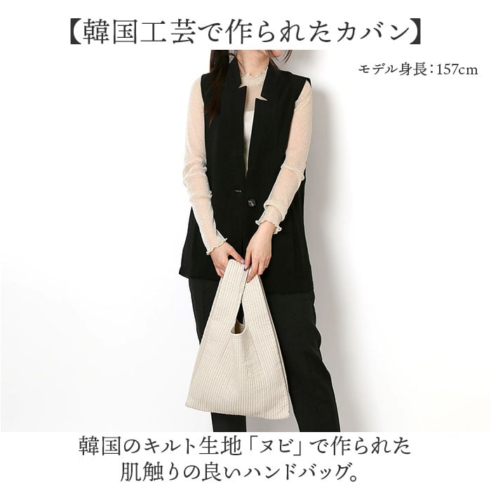 | 商品説明 | 【韓国工芸で作られたカバン】韓国のキルト生地「ヌビ」で作られた肌触りの良いハンドバッグ。【ヌビとは】布と布の間に綿を挟み入れ、一定感覚で縫い合わせた韓国のキルト工芸ヌビ。【赤ちゃん用アイテムにも使用】柔らかい凹凸と肌触りの良さが特徴的◎赤ちゃん用の布団としても使われる生地。【超軽量】小物をたくさん入れても重くなく持ち運びやすい超軽量キルティング生地。【毎日使いに便利なサイズ】長財布や、スマホ、ペットボトルがザクザク入るサイズ感。ワンマイルから毎日使いまで対応。【仕分けて収納】仕切りとオープンポケットがついているので、小物を仕分けて収納可能!【洗濯機OK】綿100%でできており、洗濯機で丸洗いOK!お手入れも楽チン、いつでも清潔に使用可能。【折りたたみ可能】柔らかくしわが目立たないキルティング生地だから、折りたたみ可能!サブバッグとしても活躍【ポケット仕様】メインルーム・・・仕切り付き、オープンポケット×1 |