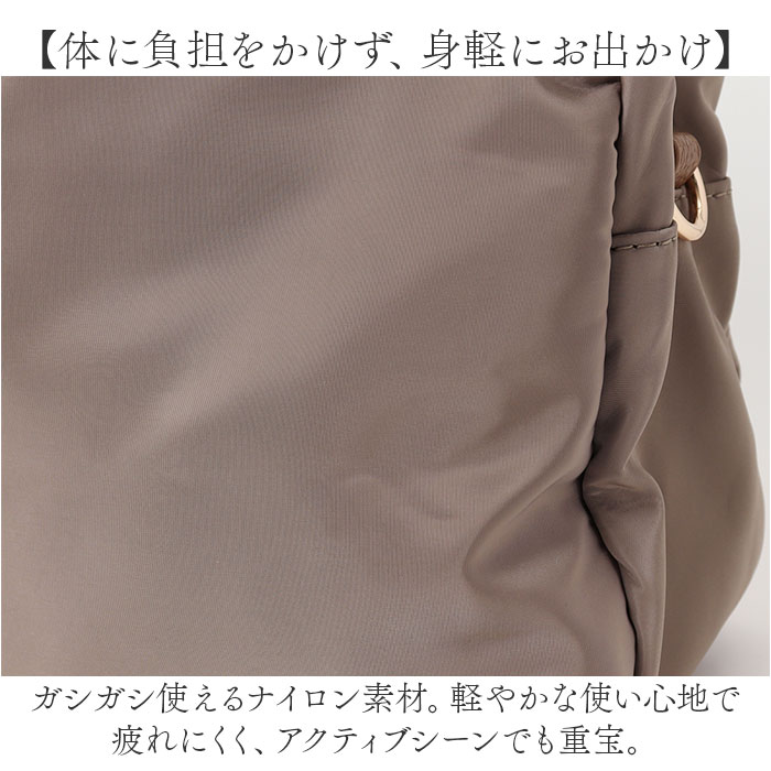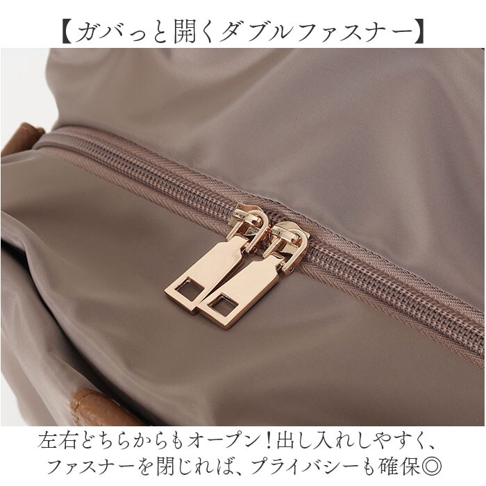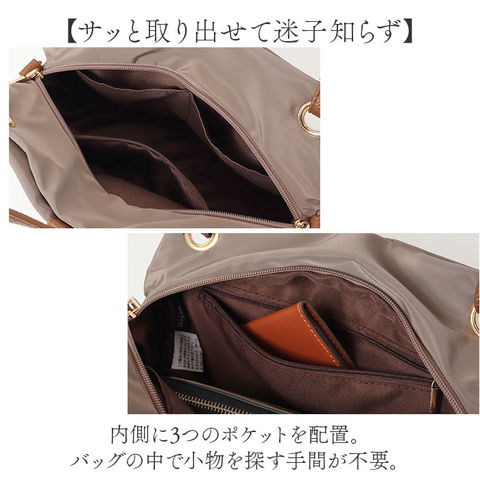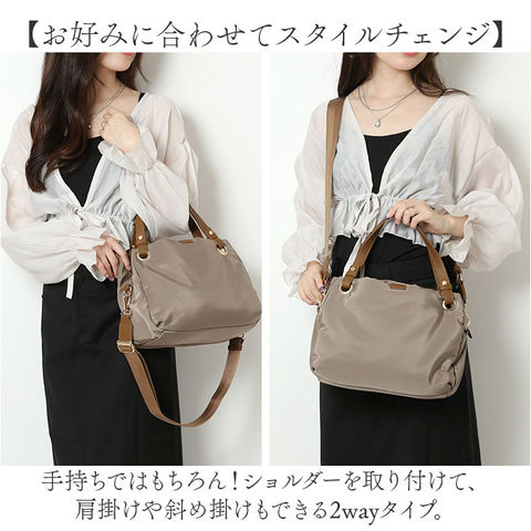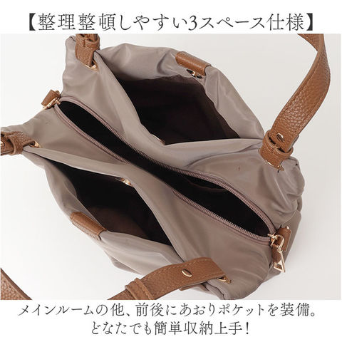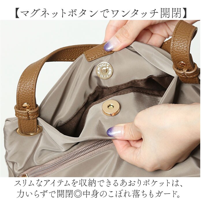 | 商品説明 | 【お出かけの相棒にぴったり】サッと持ち出せて、使い勝手抜群。「Rename ナイロン2wayトートバッグ」が新登場。【カジュアルにもキレイめにもマッチ】シンプルながらトレンド感のある、大人可愛い仕上がり。オン・オフ問わずヘビロテ間違いなし!【お好みに合わせてスタイルチェンジ】手持ちではもちろん!ショルダーを取り付けて、肩掛けや斜め掛けもできる2wayタイプ。【整理整頓しやすい3スペース仕様】メインルームの他、前後にあおりポケットを装備。どなたでも簡単収納上手!【ガバっと開くダブルファスナー】左右どちらからもオープン!出し入れしやすく、ファスナーを閉じれば、プライバシーも確保◎【マストアイテムがひとまとめ】メインルームは、A5サイズや500mlのペットボトルが横向きに。コスメポーチなどもIN。【マグネットボタンでワンタッチ開閉】スリムなアイテムを収納できるあおりポケットは、力いらずで開閉◎中身のこぼれ落ちもガード。【サッと取り出せて迷子知らず】内側に3つのポケットを配置。バッグの中で小物を探す手間が不要。【体に負担をかけず、身軽にお出かけ】ガシガシ使えるナイロン素材。軽やかな使い心地で疲れにくく、アクティブシーンでも重宝。【ちょっとの雨なら大丈夫】表面には微弱な撥水性。多少の雨なら早めに拭き取ることで、浸透を最小限に。(※)完全防水ではありません。【フェミニンな雰囲気をプラス】フェイク素材や、ゴールドの金具使いがおしゃれ♪落ち着きのあるカラーをラインナップ。【ポケット仕様】メインルーム前後:マグネット式あおりポケット×2内側:ファスナーポケット×1、オープンポケット×2 |