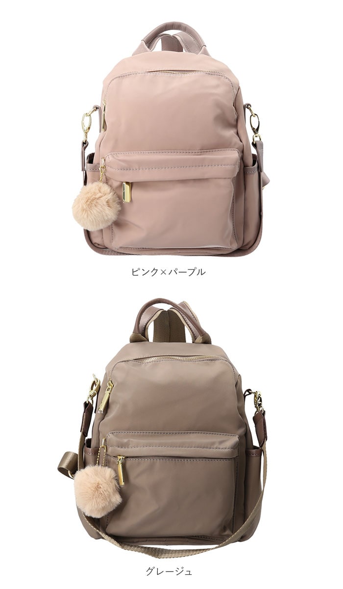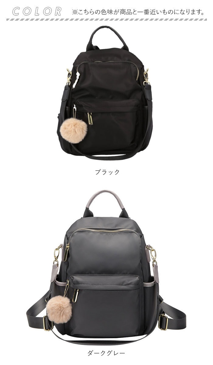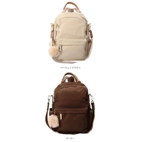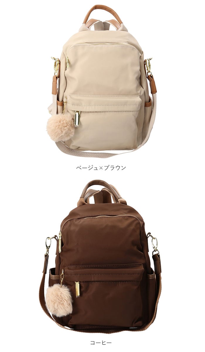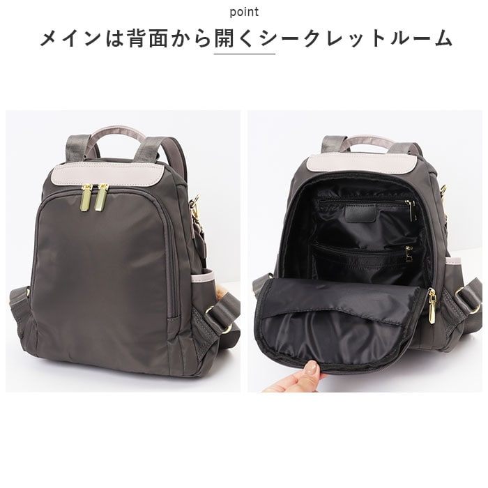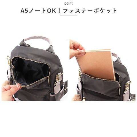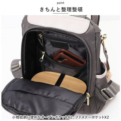 | 商品説明 | 通勤やちょっとしたお出かけに便利なリュック。【ちょうどいいサイズ感】見た目はコンパクトなのに、9つの収納で見た目以上の収納力。大きすぎず、小さすぎない、軽くてちょうどいいサイズ感が嬉しい♪【3WAY仕様】リュックとしてだけでなく、肩掛けやトートバッグとしても使える3WAY仕様。ショルダーベルは取り外し可能なので自分お好みでアレンジ自在!【メインルームはきちんと整理】メインは背面から開くシークレットルーム。開口部は大きく開くラウンドファスナータイプで、出し入れがしやすい◎小物収納に便利なオープンポケットX2、ファスナーポケットX2があるので、散らかりがちなバッグの中身をきちんと整理整頓出来る。約12cmのマチはお弁当を水平に入れられる広さ。(※お手持ちのお弁当箱のサイズをご確認ください。)【フロントポケット】フロントにはA5ノートやタブレットなどの収納に使える少し大きめのファスナーポケットと、定期や鍵など使用頻度の高い小物を入れるのに便利なファスナーポケット付き。【サイドポケット】サイドにもオープンポケットを配置し、スリムなウォーターボトルやミニ折りたたみ傘を収納するのにちょうどいい♪【撥水効果】程よいツヤ感が高見えする生地の表面には撥水効果があり、水滴や汚れが付いてもサッと拭き取れて汚れが付きにくい◎【大人っぽさと可愛さをMIX】引き手などにはフェイクレザーを使用し、ゴールドの金具と付属のふわふわのチャームが大人っぽさと可愛さをMIX。通勤やデイリー使いはもちろん、旅行用のサブバッグとして使うのもおススメ。 |