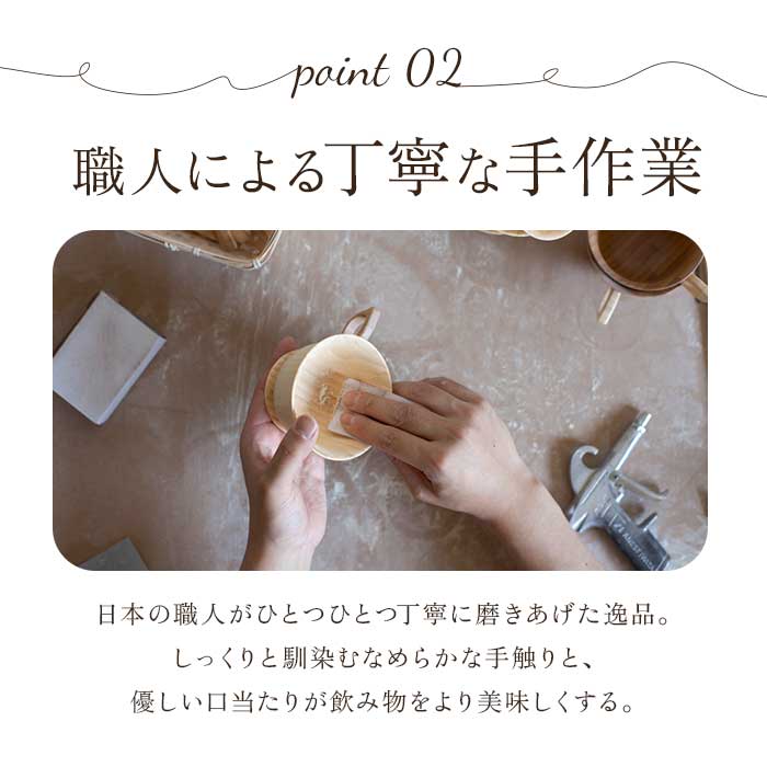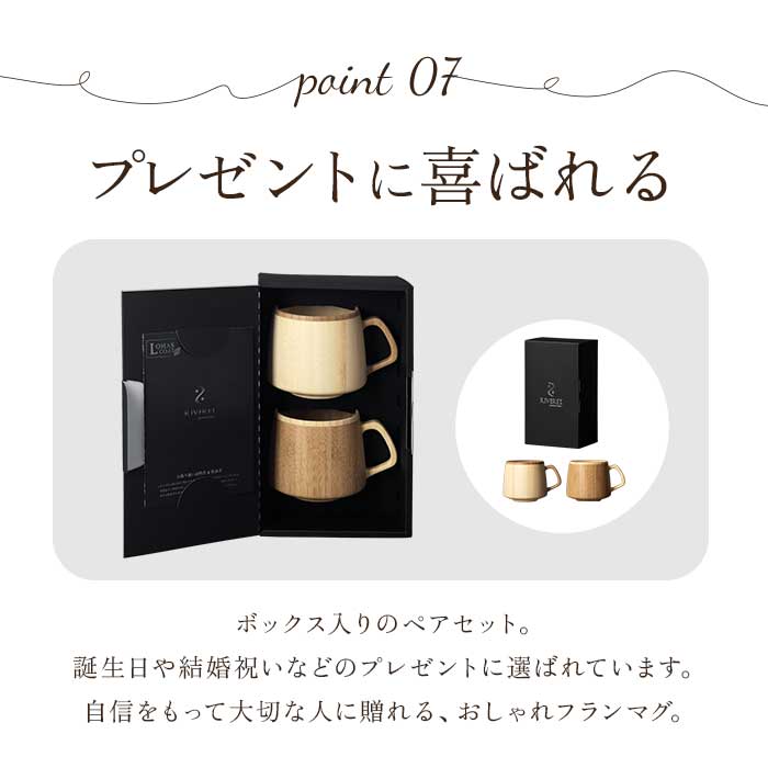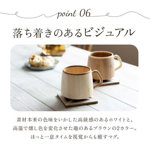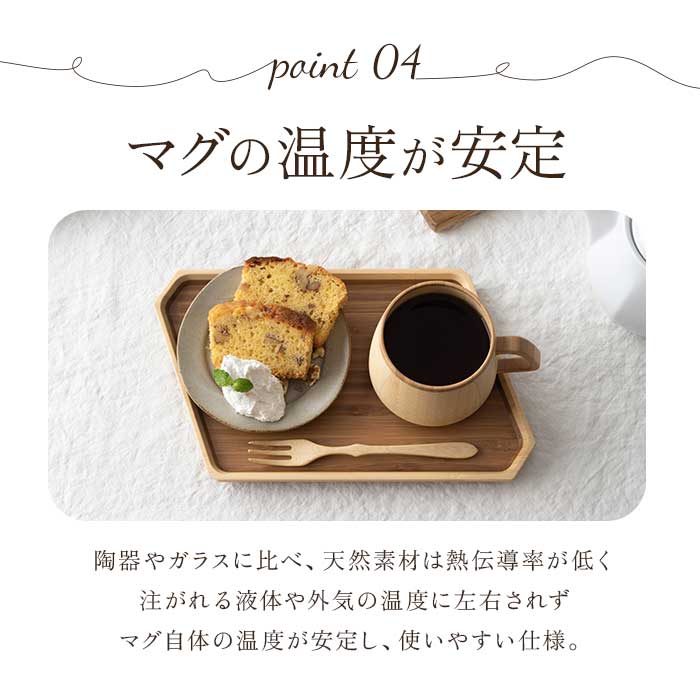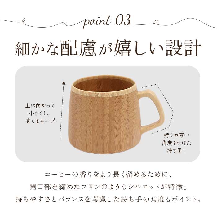 | 商品説明 | いつものティータイムがワンランクアップ!天然素材を使用した、おしゃれなフランマグのペアセットが新登場。【温かみのあるフランマグ】プリンのような可愛らしいシルエット。香りをより長く留めるための小さく締まったリム(開口部)が特徴。【職人こだわりの設計】持ちやすさとバランスを考慮した持ち手の角度がポイント。【ナチュラルな風合い】中国・江西省地方にある竹林にて収穫された、天然孟宗竹を使用。【天然素材ならではの魅力】見た目も質感も柔らか。しっくりとなじむ手ざわりと、優しくなめらかな口あたり♪【味わいを存分に楽しめる♪】陶器やガラス製品に比べ熱伝導率が低いので、注がれる液体や外気の温度に左右されずマグ自体の温度が安定。【コーヒーや様々なお茶に】深煎りの薫り高いコーヒー、華やかに香るハーブティー、スパイスの効いたチャイに。【安心・安全のロハスコート】天然緑茶成分配合の塗料と、竹本来の持つフィトンチッドの相乗効果で「大腸菌・黄色ブドウ球菌の抑制」を実証した独自開発技術。(※全ての菌に対する抑制・永続的な効果を保証するものではありません。)【6層コーティング仕様】素材の内部まで浸透させるコーティング。コーヒなどの色移りや染み込みを防止してくれるので、陶器などと同様に普段使いが可能。【使い勝手の良いサイズ感】容量約310ml。コーヒーブレイクにぴったり◎【お手入れがラクチン】うれしい食器洗い乾燥機対応で、忙しい毎日の味方!【異なる風合いを楽しめる2カラー】天然素材本来の色味をいかした高級感のあるホワイトと、高温で燻すことで色を変化させた趣のある色合いのブラウンの2カラー。【ギフトにも!】ボックス入りのペアセット。誕生日や結婚祝いなどのプレゼントに最適。 |