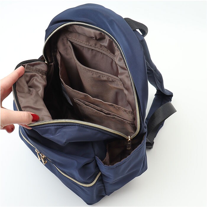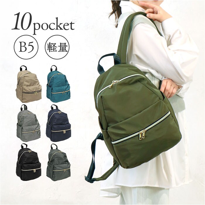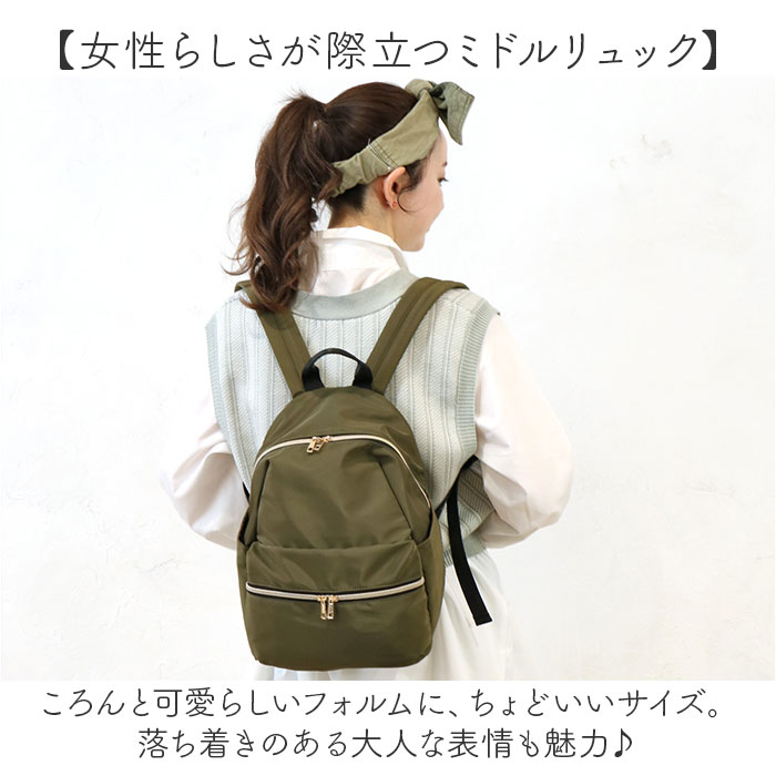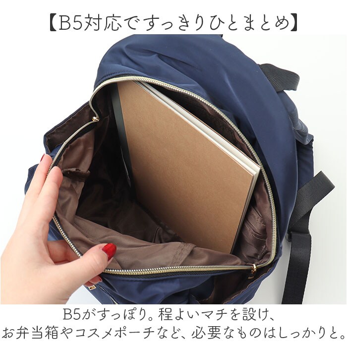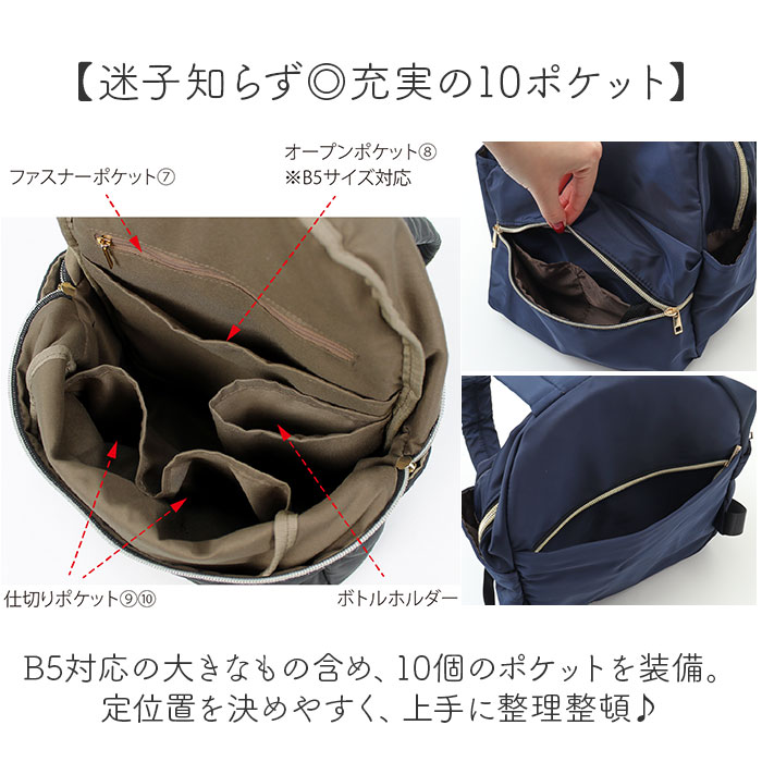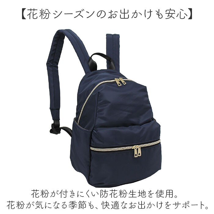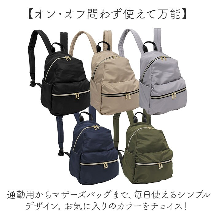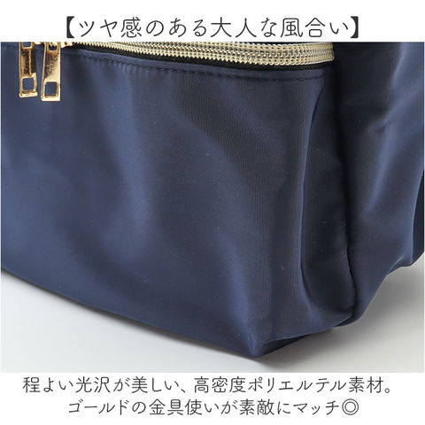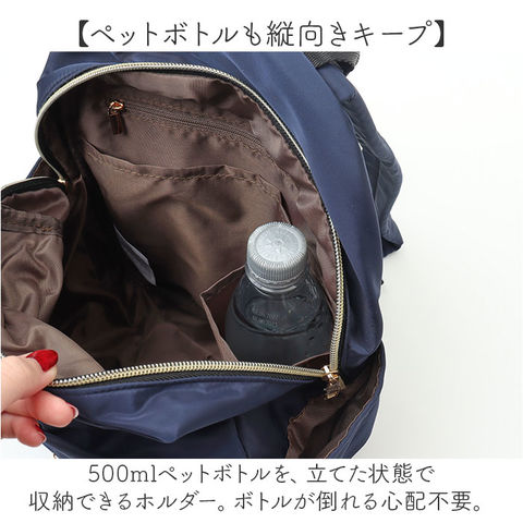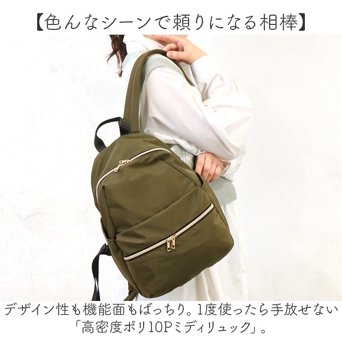 | 商品説明 | 【色んなシーンで頼りになる相棒】デザイン性も機能面もばっちり。1度使ったら手放せない「高密度ポリ10Pミディリュック」。【女性らしさが際立つミドルリュック】ころんと可愛らしいフォルムに、ちょどいいサイズ。落ち着きのある大人な表情も魅力♪【ガバっと開くダブルファスナー】左右どちらからもオープン!取り出しやすく、ファスナーを閉じればプライバシーを確保。【B5対応ですっきりひとまとめ】B5がすっぽり。程よいマチを設け、お弁当箱やコスメポーチなど、必要なものはしっかりと。【迷子知らず◎充実の10ポケット】B5対応の大きなもの含め、10個のポケットを装備。定位置を決めやすく、上手に整理整頓♪【ペットボトルも縦向きキープ】・500mlペットボトルを、立てた状態で収納できるホルダー。ボトルが倒れる心配不要。【鍵やパスケースも紛失防止】前面ポケット内にはキーフック付き。使用頻度の高いアイテムも、サクッと取り出し。【背負い心地軽やかでストレスフリー】体に負担がかかりにくい軽量設計。ショルダーと背面には、クッション性をプラス。【ツヤ感のある大人な風合い】程よい光沢が美しい、高密度ポリエルテル素材。ゴールドの金具使いが素敵にマッチ◎【花粉シーズンのお出かけも安心】花粉が付きにくい防花粉生地を使用。花粉が気になる季節も、快適なお出かけをサポート。【オン・オフ問わず使えて万能】通勤用からマザーズバッグまで、毎日使えるシンプルデザイン。お気に入りのカラーをチョイス!【ポケット仕様】内側:ファスナーポケット×1、オープンポケット×3前面:ダブルファスナーポケット×1(内側にオープンポケット×2)サイド:オープンポケット×2背面:シークレットポケット×1 |