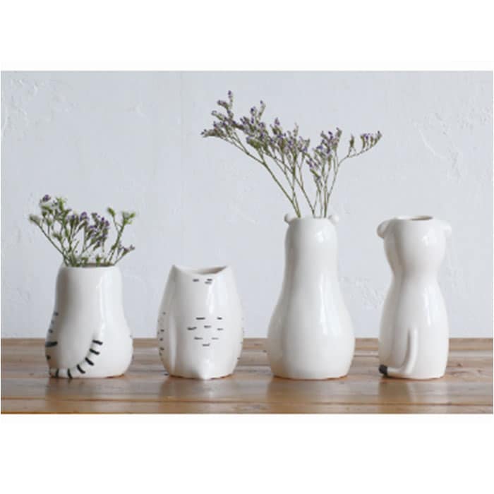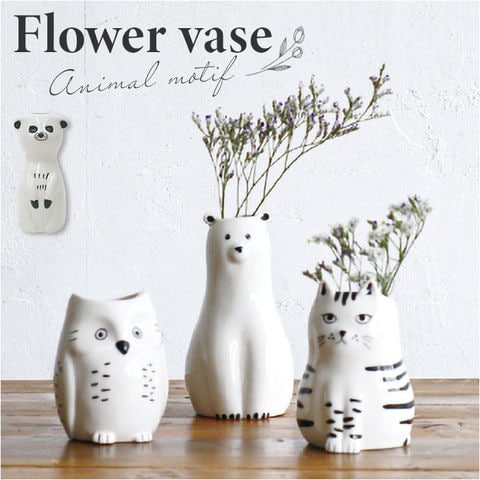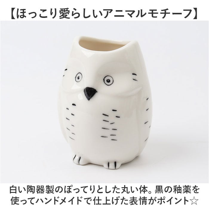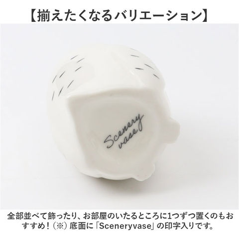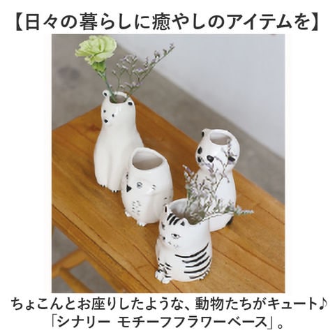 | 商品説明 | 【日々の暮らしに癒やしのアイテムを】ちょこんとお座りしたような、動物たちがキュート♪「シナリー モチーフフラワーベース」。【ほっこり愛らしいアニマルモチーフ】白い陶器製のぽってりとした丸い体。黒の釉薬を使ってハンドメイドで仕上げた表情がポイント☆【場所を選ばないコンパクトサイズ】玄関やリビング等のちょっとしたスペースに飾りやすい大きさ。小さな草花やドライフラワーを。【置くだけでも素敵なインテリア】ペン立てや歯ブラシスタンドとして。そのままオブジェとして飾るだけでもOK◎【揃えたくなるバリエーション】全部並べて飾ったり、お部屋のいたるところに1つずつ置くのもおすすめ!(※)底面に「Sceneryvase」の印字入りです。【お誕生日などのプレゼントにも最適】インテリアの邪魔をせず、どんな空間にも馴染むナチュラルデザイン。贈り物にも喜ばれそう♪ |