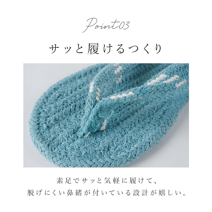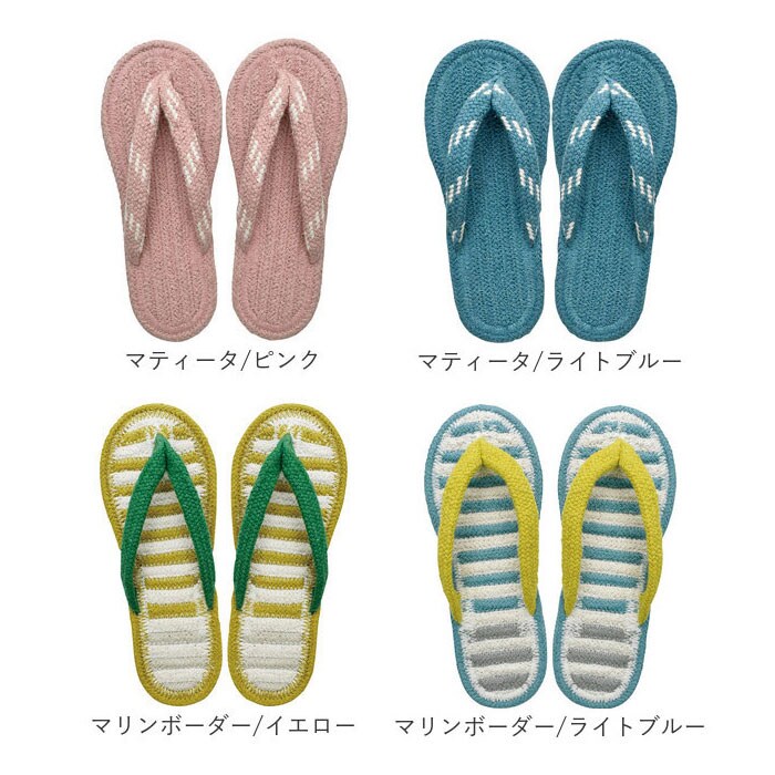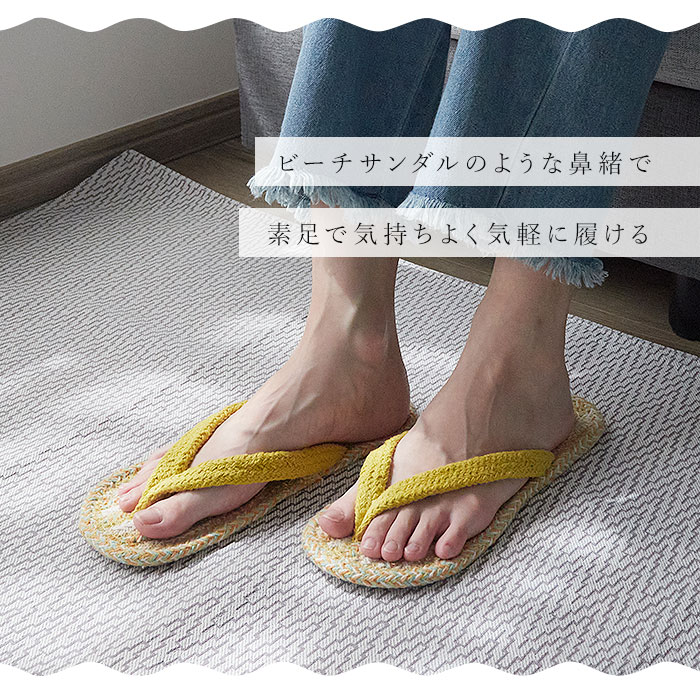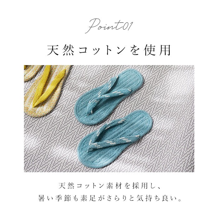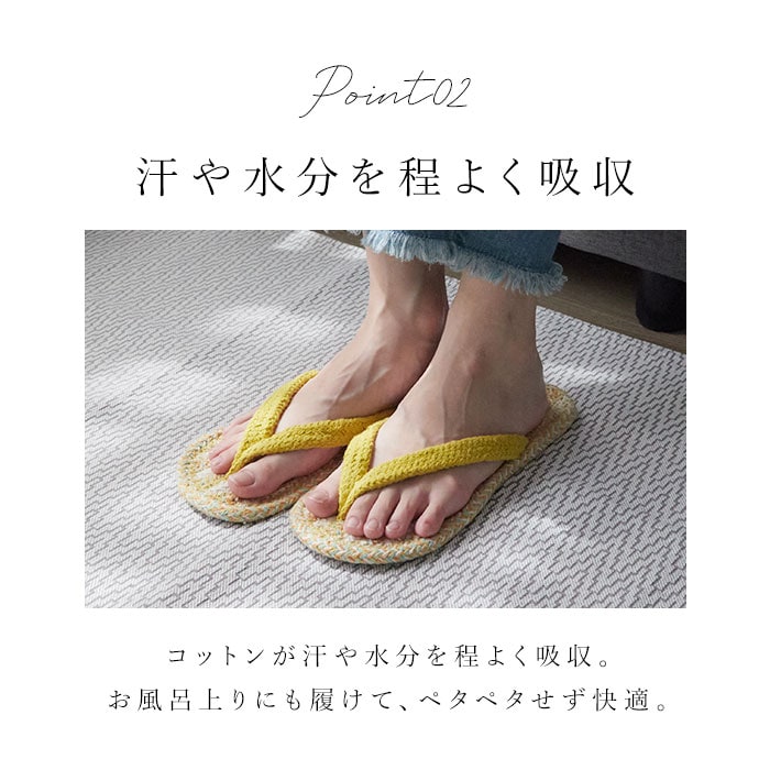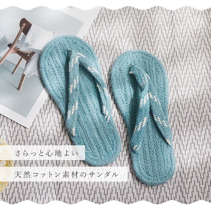 | 商品説明 | 天然コットン素材でサラサラの履き心地!リラックスタイムに履けるレディースコットンサンダル。ビーチサンダルのような鼻緒が付いて、素足で気持ちよく気軽に履ける!天然コットン素材が肌にやさしいルームサンダル。コットンが汗や水分を程よく吸収!お風呂上りにサッと履けて、フローリングでもペタペタしなくて快適♪スリッパのようにつま先が覆われていないので、真夏でも足がムレずに爽やか。ビーチサンダルタイプなので、見た目にも涼し気で清潔感もバッチリ!鼻緒部分もコットン素材で、指の付け根が痛くなりにくいやさしい造り。ゆったり履けるフリーサイズ。(底面の外寸は約25cmです。)コットン素材なので、気軽に手洗いが出来て、お手入れ簡単。いつでも清潔に履ける! |