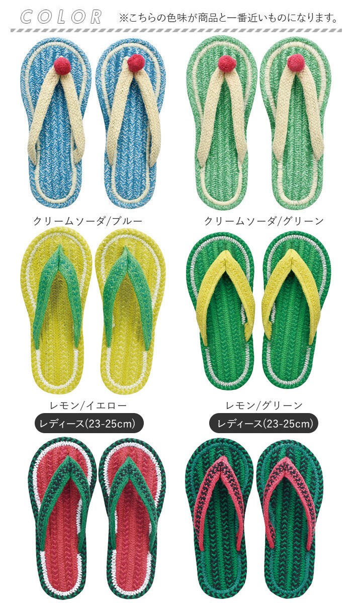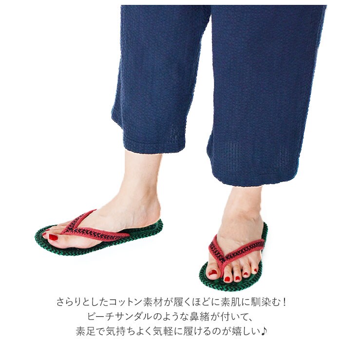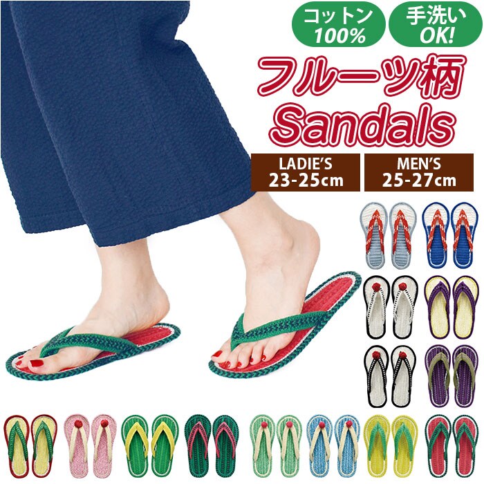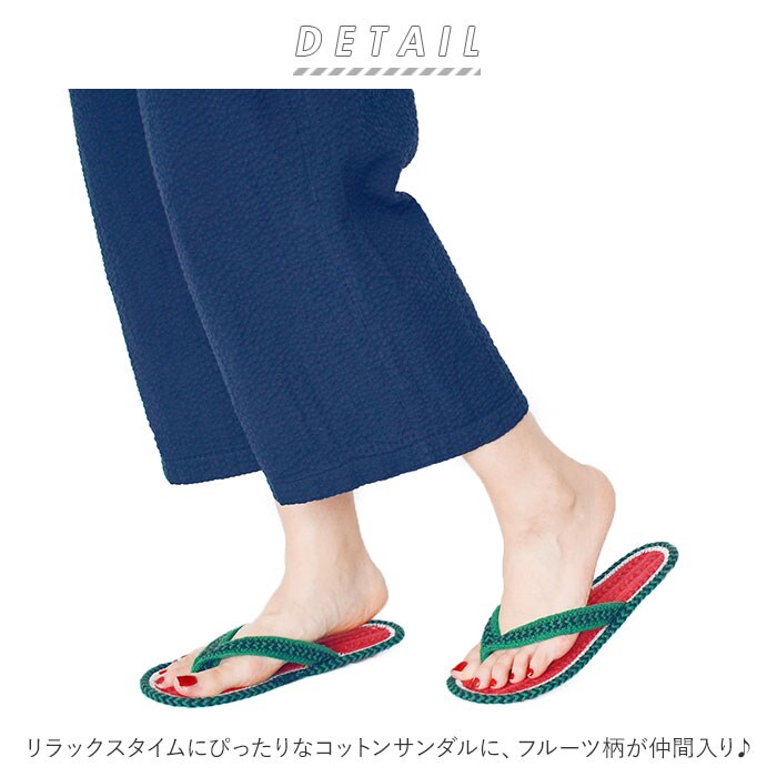 | 商品説明 | リラックスタイムにぴったりなコットンサンダルに、フルーツ柄が仲間入り♪さらりとしたコットン素材が履くほどに素肌に馴染む!ビーチサンダルのような鼻緒が付いて、素足で気持ちよく気軽に履けるのが嬉しい。汗や水分を程よく吸収するので、お風呂上がりにサッと履けて、フローリングでもペタペタしなくて快適◎鼻緒部分もコットン素材で、指の付け根が痛くなりにくい優しいつくり。スリッパのようにつま先が覆われていないので、真夏でも足がムレずに爽やか!汚れが気になったらご自宅で手洗いOK。いつも清潔に保てるのが嬉しい。メンズ用、レディース用それぞれ、ゆったり履けるフリーサイズ!鮮やかなカラーリングで夏らしさ全開のポップなデザイン♪ |