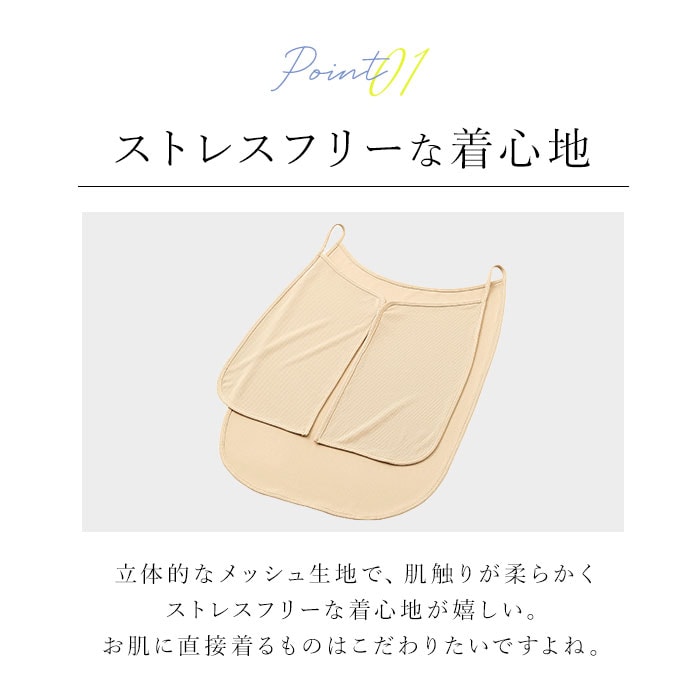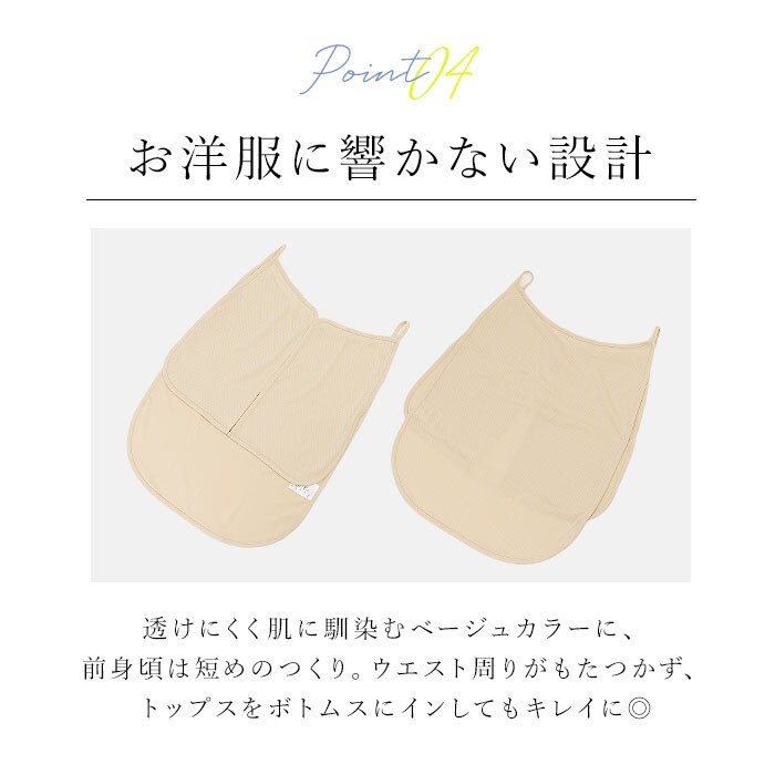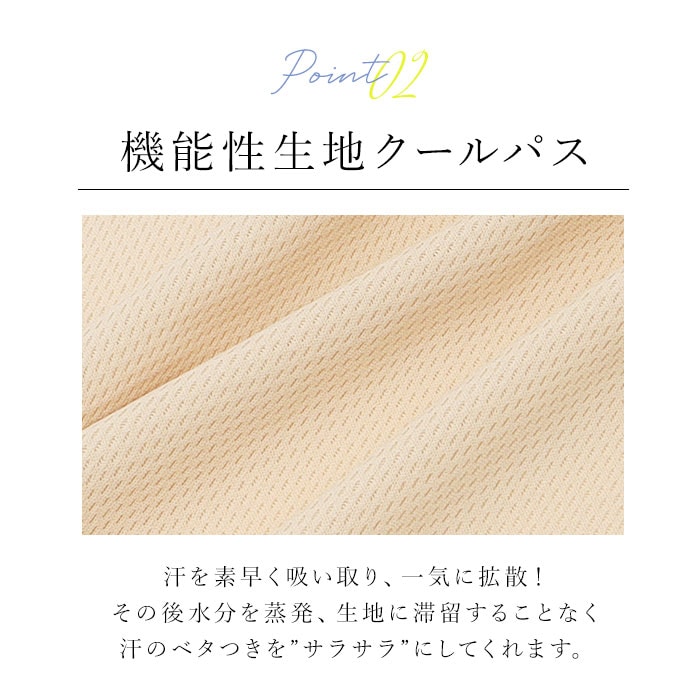 | 商品説明 | 汗をかいたことをリセット!「サッと脱げるサラスラ汗取り肌着」が新登場。【汗ジミなどのお悩みを解決】汗をかいた後の着替え場所がない…汗ジミが気になる…そんな時にとっても便利。【サッと着用できちゃう!】肌に直接着用し、胸元のホックボタンを留めて洋服を着るだけ!【着替え後のような爽快感♪】汗をかいたら、ホックボタンを外して襟元や裾からスルッと引き抜けばOK。【機能性生地クールパスを採用】汗を素早く吸い取り、一気に拡散!その後水分を蒸発、生地に滞留することなく汗のベタつきを”サラサラ”に!【さらっとした肌触り】立体的なメッシュ生地で、ストレスフリーな着心地。【薄着になる夏でも安心】肌に馴染みやすく、透けにくいベージュカラー。【ウエスト周りすっきり】前身頃は短めのつくり。ウエスト周りがもたつかず、トップスをボトムスにインしてもキレイにキマる♪【ブラの下にも!】胸の汗も吸収!汗ばむ季節も快適。【お手入れラクチン】洗濯ネットに入れて、自宅で手軽にお洗濯可能。 |