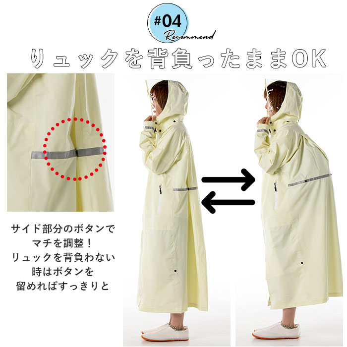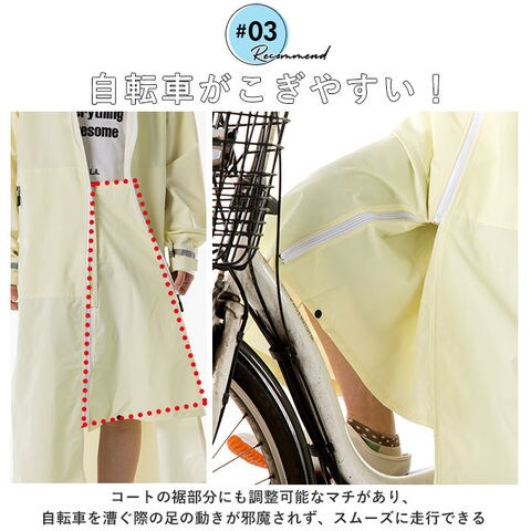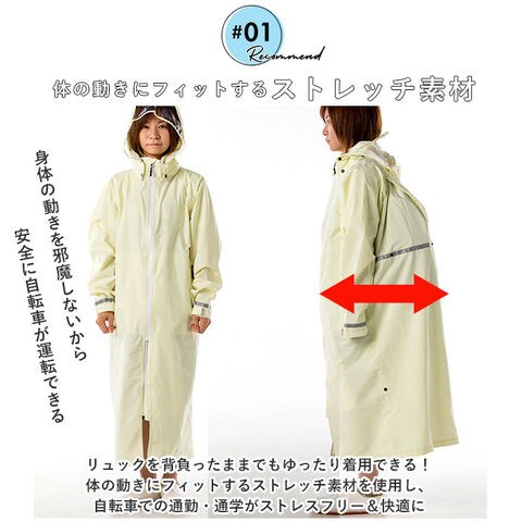 | 商品説明 | 軽量透湿×ストレッチ素材で、リュックを背負ったままでもゆったり着用できる!ストレッチレインコート。体の動きにフィットするストレッチ素材を使用し、雨の日でも自転車での通勤通学がとっても快適で機能性抜群!レインコート背面は、リュックを背負ったままでも着用可能なマチ付き。リュックを背負わない時はボタンを留めればすっきりとしたシルエットに。コートの生地は、雨や風は通さずに発汗によるムレを逃がす透湿防水資材。(※TPUラミネート加工を施したポリエステル100%素材を採用。耐水圧:10000mm/H20 透湿:5000g/m2・24h)フロントジッパーと、左右のファスナーポケットには止水ファスナーを採用し、雨風の侵入をしっかり防ぐ。レインコート両袖は、ベルクロ式テープで調節が可能。手首にしっかりとフィットして、雨の侵入を防止。取り外し可能なフードは、ヘルメットを着用したまますっぽりかぶれるゆったり構造。透明素材のツバが広くとられたデザインで、左右前方がしっかりと見える。フードはコートのハイネック部に2段式ボタンでしっかり取り付け!後頭部のアジャスターでかぶり深さも調整可能。コートの裾部分にも調整可能なマチがあるため、自転車を漕ぐ際の足の動きが邪魔されず、スムーズに走行できる!レインコート背面と両袖にリフレクタ素材の反射テープ付きで、早朝や夜間でもすれ違う車からの視認性が高くなり、安全性を確保。コート背面にフック付きで、着用後に濡れたコート干す際にも便利。持ち運びに便利な携帯袋が付属。 |