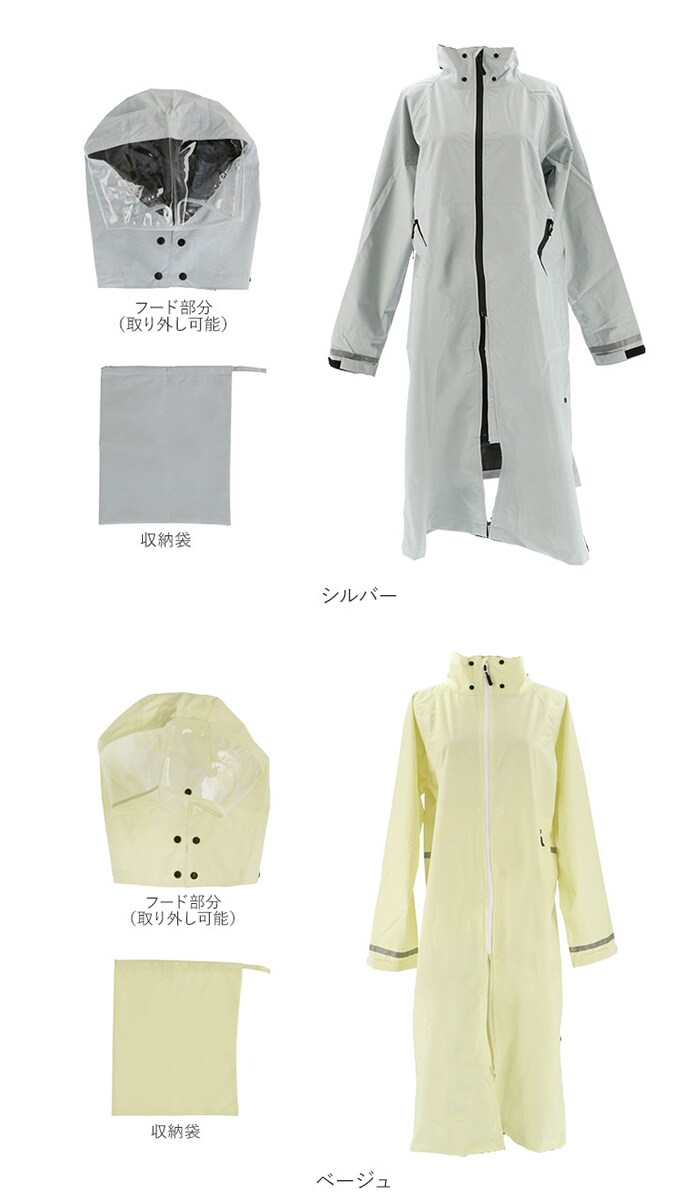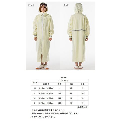 | 注意点 | ご使用後は乾いた布で拭きとり、直射日光を避けて日陰干しをし、風通しのよい所に保存してください。汚れは中性洗剤か、ぬるま湯で優しく手洗いしてください。汚れがひどい場合は、表面は柔らかいブラシを使い裏面はコーティングを傷つけないようスポンジなどで汚れを落としてください。洗濯機、ドライクリーニング、乾燥機のご使用はお避けください。ポケットの中に防水性はありません。[自転車使用時のご注意]自転車との組み合わせによってレインコートの裾や、レインウェアの調整紐が駆動部に接触し巻き込まれる可能性があります。ご使用の際には、レインウェアと駆動部が接触しないようにご注意ください。レインウェアの収納袋を前かごに入れて運転する場合、前かごの目が粗いと、収納袋の口をしめる調整紐が垂れ下がる場合があります。垂れ下がった調整紐が駆動部に接触した場合、巻き込まれて駆動部が停止し転倒する可能性があるので、短く束ねてご使用ください。使用する前に、フードを調節し首を左右に振った際に視界が遮られることがないか確認してください。レインウェア着用後の自転車乗降時は、レインウェアが自転車に引っかかり転倒する恐れがありますので注意してください。 |