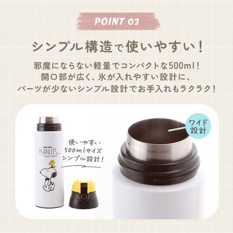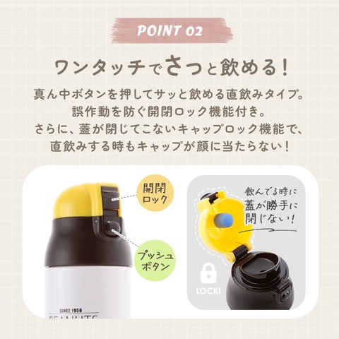 | 商品説明 | 人気キャラクターの柄がかわいい!飲みたい時に手軽にサッと飲める、ワンプッシュステンレスマグボトル!そのまま飲めるキャップユニットで、気軽に直飲みができるマグボトル。オフィスや外出先で、のどの渇きをすぐに癒したい時にぴったり。キャップは、ワンプッシュで簡単オープン!誤作動による開閉を防ぐロック機能付き。さらに、キャップが倒れてこないキャップロック機能付きで、直飲みする時もキャップが顔に当たらない♪飲み口は、口当たりがソフトなプラスチックタイプ。キャップユニットを外すと、ボトル開口部が広口になったワイド設計で、飲み物に氷が入れやすい。真空二重構造で、保温保冷効果しっかり長持ち。通勤用トートに入れても邪魔にならない軽量コンパクト設計&たっぷり入る500ml!ペットボトル飲料を持ち歩くよりエコでお財布にも優しい♪ミッキーやスヌーピーなど、学生さんや大人女子にも人気の絵柄をバラエティー豊富にラインナップ。お気に入りのデザインがきっと見つかる! |