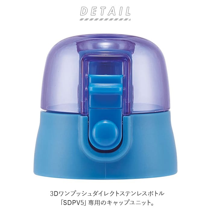 | 商品説明 | 人気キャラクターの立体プリントでおなじみ!3Dワンプッシュダイレクトステンレスボトル「SDPV5」専用のキャップユニット。キャップが壊れてもユニットごと交換すれば、お気に入りの水筒を長~く使えてとっても経済的!乾いた喉にダイレクト!キッズも元気にごくごく飲める、口にくわえる直飲みタイプ。キャップユニットはワンプッシュで簡単オープン!誤作動による開閉を防ぐロック機能も搭載。さらに、飲んでいるときにフタが倒れてこないキャップロック設計で、キャップが顔に当たらず、飲みやすいのがポイント。簡単に取り外しのできる飲み口パッキンとフタパッキンが付属しているので、お手入れもとっても簡単。自分だけの水筒にカスタマイズ♪男の子にも女の子にも使いやすい、カラフルなカラーバリエーション。 |