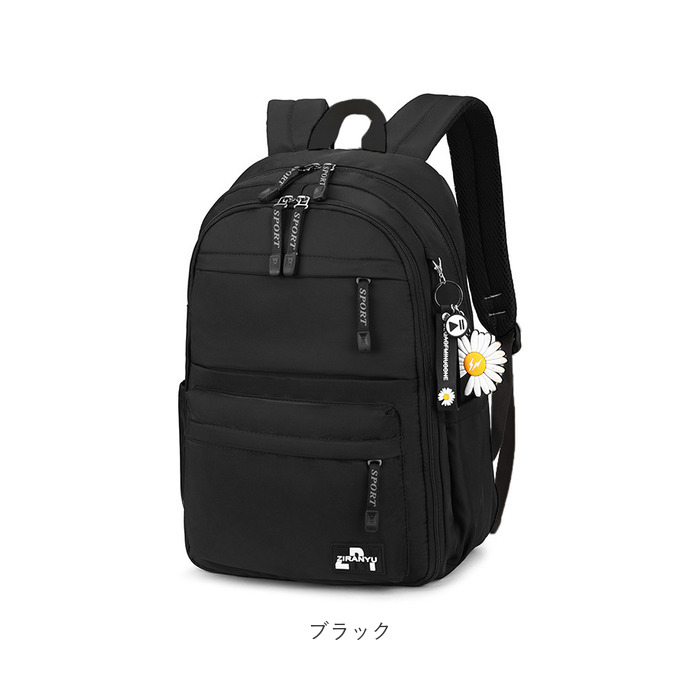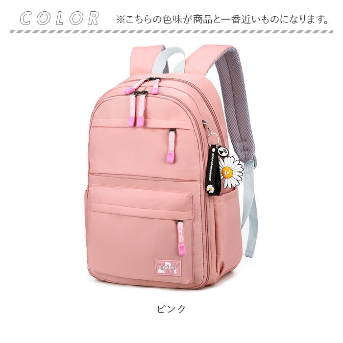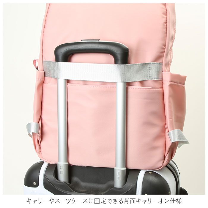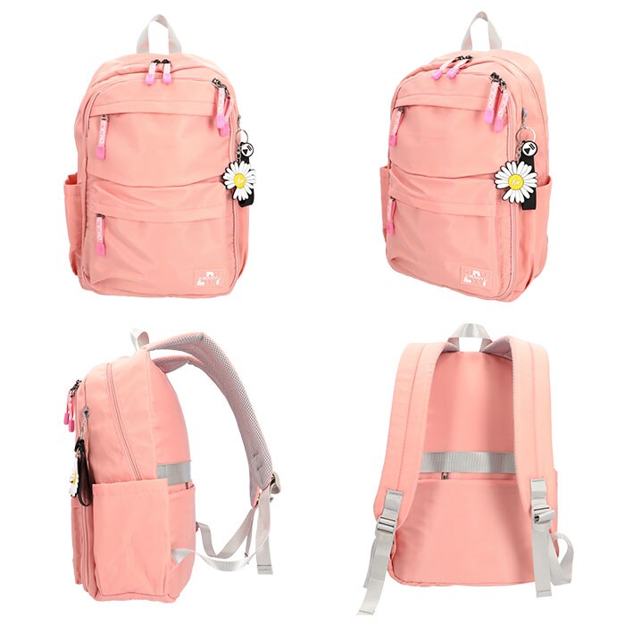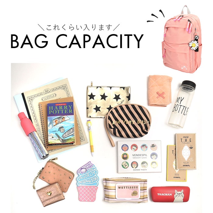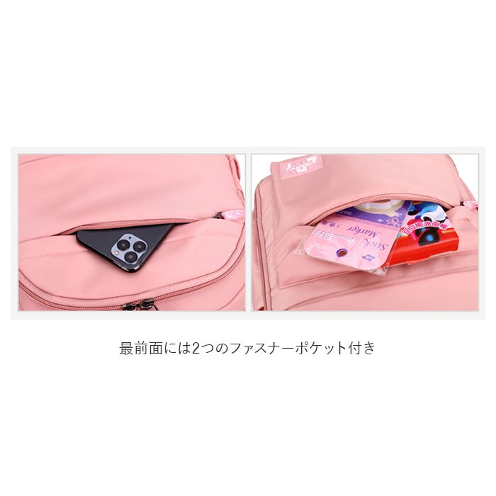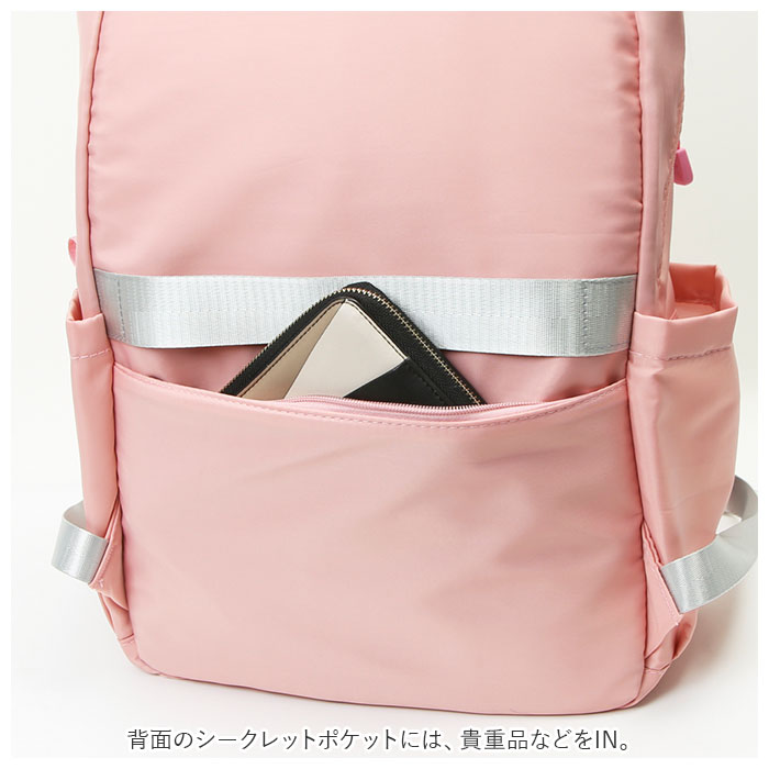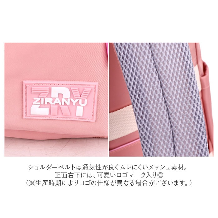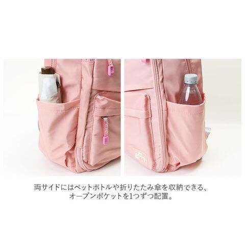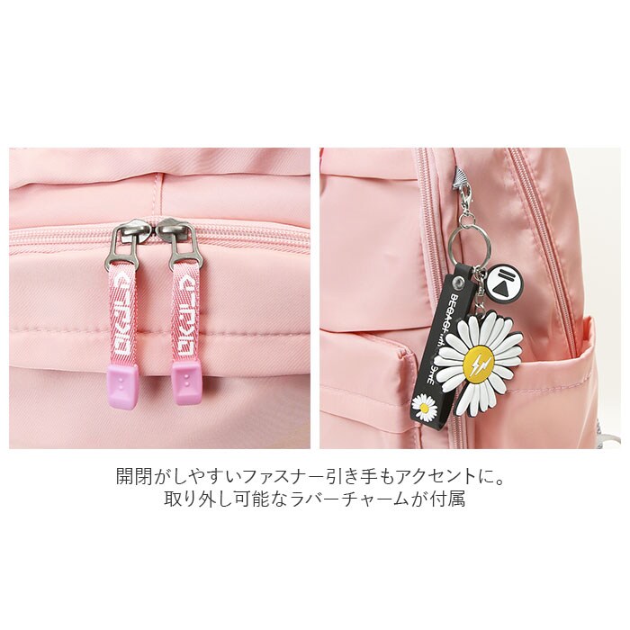 | 商品説明 | 収納力抜群!通学や遠足、旅行などで大活躍のリュックが登場。メインルーム開口部は、側面まで大きく開くダブルファスナー式。内側はB4サイズがぴったり収まるサイズ感◎マチと深さがあり、お出かけに必要な荷物をたっぷりと収納可能。タブレットやノートPCを収納できるクッションポケットを装備。メインルーム前のファスナーポケットをガバっと開くと、多数のポケット付きルームが登場★小物をすっきり整理できて、取り出しもラクチン。向かって左側・・・オープンタイプのメッシュポケット×2、ファスナータイプのメッシュポケット×1。向かって右側・・・A4サイズ対応のオープンポケット×1、オープンポケット×2、ペンホルダー×2。最前面には2つのファスナーポケット付き。両サイドにはペットボトルや折りたたみ傘を収納できる、オープンポケットを1つずつ配置。背面のシークレットポケットには、貴重品などをIN。キャリーやスーツケースに固定できる背面キャリーオン仕様。背面とショルダーベルトはクッション性があり、背負い心地快適◎ショルダーベルトは通気性が良くムレにくいメッシュ素材。リュック表面に水滴や汚れをサッと弾く、撥水加工済み。(※完全防水ではありません。)開閉がしやすいファスナー引き手もアクセントに。取り外し可能なラバーチャームが付属。 |