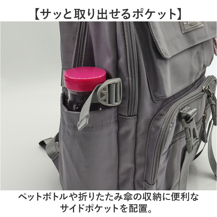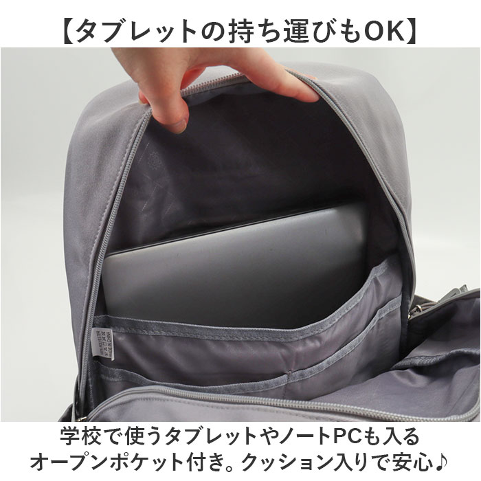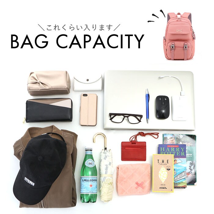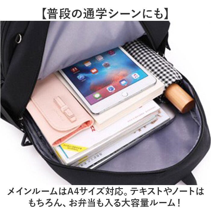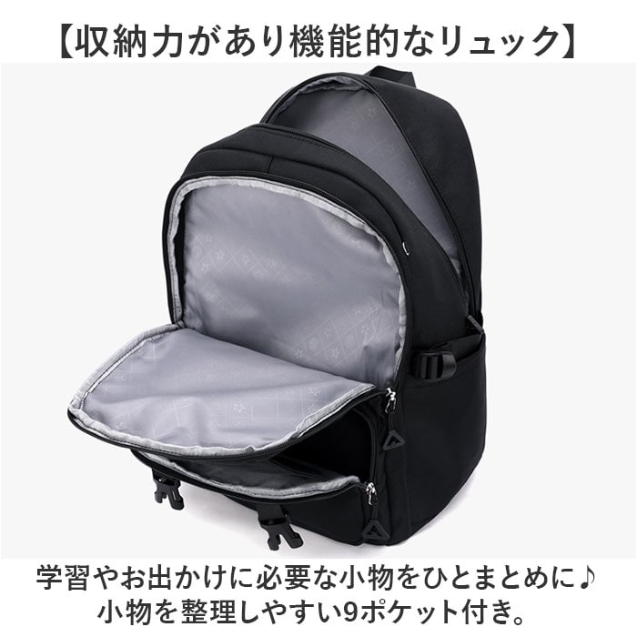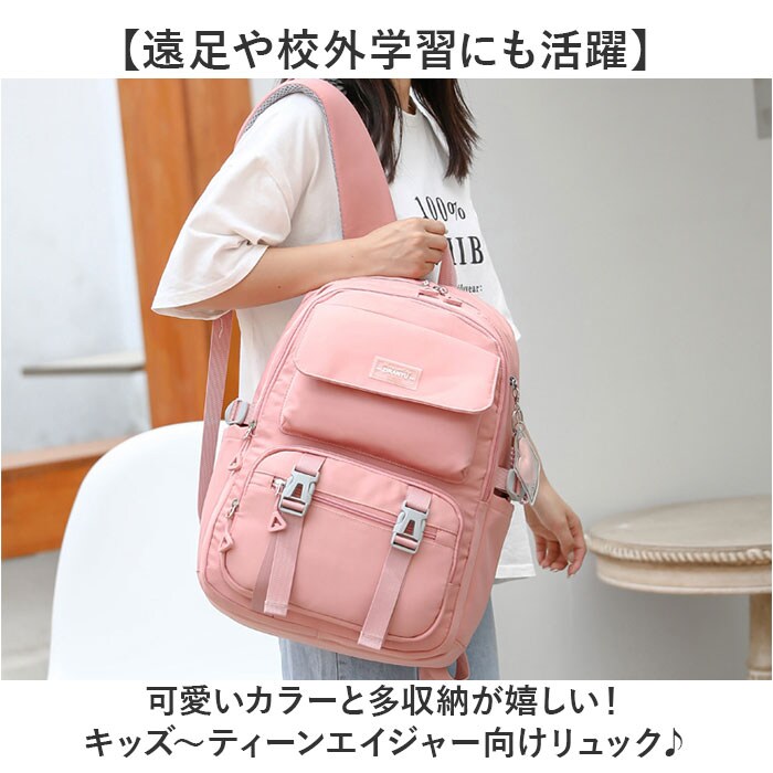 | 商品説明 | 【遠足や校外学習にも活躍】可愛いカラーと多収納が嬉しい!キッズ~ティーンエイジャー向けリュック♪【収納力があり機能的なリュック】学習やお出かけに必要な小物をひとまとめに♪小物を整理しやすい9ポケット付き。【普段の通学シーンにも】メインルームはA4サイズ対応。テキストやノートはもちろん、お弁当も入る大容量ルーム!【タブレットの持ち運びもOK】学校で使うタブレットやノートPCも入るオープンポケット付き。クッション入りで安心♪【サブルーム付き】大切な書類やタオルなど独立して収納できるサブルームをフロントに搭載。【迷子になりがちな小物をIN】フロントのポケットはスマホやキーケースなど迷子になりがちな小物入れに。【サッと取り出せるポケット】ペットボトルや折りたたみ傘の収納に便利なサイドポケットを配置。【荷物の量に合わせてスマートに】サイドに調節機能が付いたベルトを取り付け、荷物の量に合わせてスマートなシルエットに【貴重品入れに最適】背面には長財布も入る大きめのファスナーポケット付き。お財布など貴重品入れにピッタリ♪【長期旅行や遠征も活躍】キャリーオンベルトが付いており、キャリーケースのハンドルに取り付け可能。【背負い心地快適】背面とショルダーベルトは程よいクッション入り。ムレにくいメッシュ素材なのもGOOD。【Dカン付き】ストラップやカラビナなどの取り付けに便利なDカンをフロントに搭載。【可愛いチャーム付き】可愛いチャーム付属。シーンや気分で取り外し可能!単品使いもOK!【ポケット仕様】メインルーム:PCポケット×1、オープンポケット×2フロント:サブルーム×1、ファスナーポケット×1、フラップポケット×1両サイド:オープンポケット×1ずつ背面:ファスナーポケット×1 |