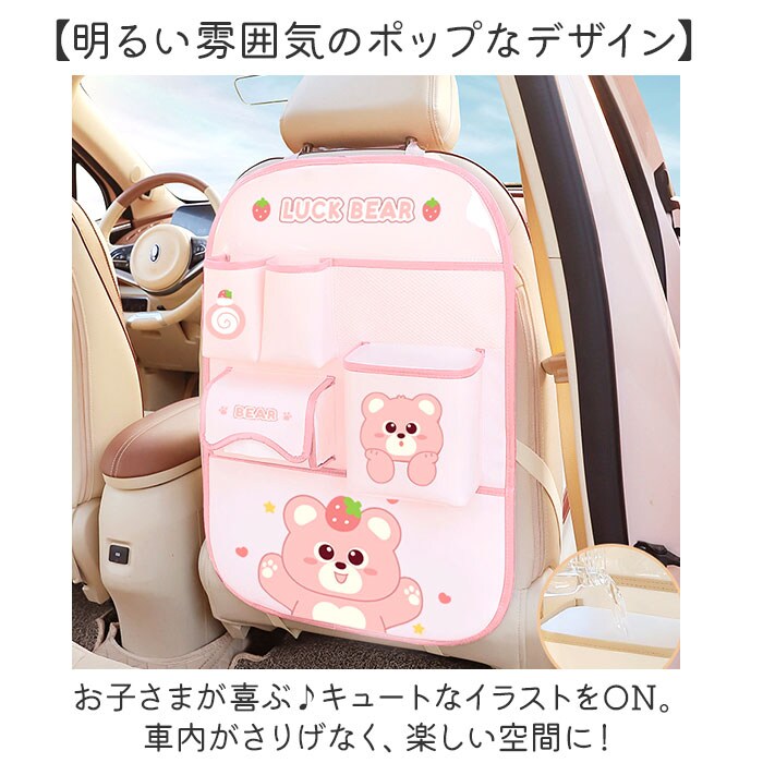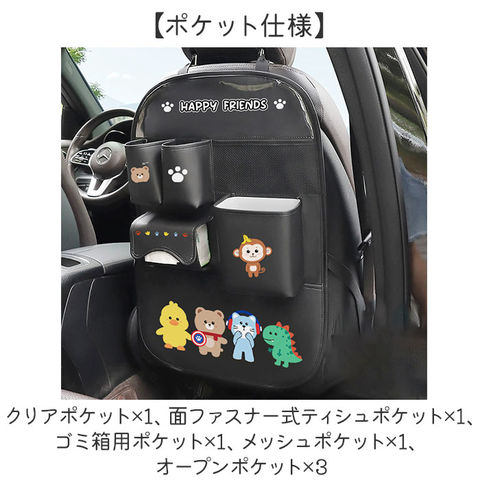| 商品説明 | 【快適なドライブをサポート!】車のシートに取り付け◎必要な物を定位置に納めて、空間を有効活用!「車収納ポケット」。【簡単装着できてピタッとフィット】バックルベルトをヘッドレストに取り付け、サイドと下部は伸縮ゴムのフックで固定。(※1)バックルベルトは長さ調節可能です。【スマホを入れて動画視聴も操作も】クリアポケットに、スマホを横向き収納♪入れたまま操作でき、ハンズフリーで動画視聴!(※2)画面フォルムなどを貼っている場合は、反応しない可能性もございます。【ドリンクやお菓子も定位置に】上部2つのオープンポケットには、ペットボトルやスリムなお菓子の箱を。【ティッシュをサッと手に取れる】面ファスナー式のティッシュケース。フラップの隙間から引き出し、ティッシュを探す手間不要。【ゴミもポイっと捨てられる】付属のケースをマチ付きのポケットにIN。簡易ゴミ箱が完成し、ケースは丸洗いOK。【そのほかの小物もすっきり収納】メッシュポケット&下部の大きなオープンポケット。自分仕様に使えて便利。【撥水素材でお手入れも簡単】水滴や汚れをサッと弾く撥水性。お手入れも拭き取るだけ。(※3)完全防水ではありません。【明るい雰囲気のポップなデザイン】お子さまが喜ぶ♪キュートなイラストをON。車内がさりげなく、楽しい空間に!【ポケット仕様】クリアポケット×1、面ファスナー式ティシュポケット×1、ゴミ箱用ポケット×1、メッシュポケット×1、オープンポケット×3 |