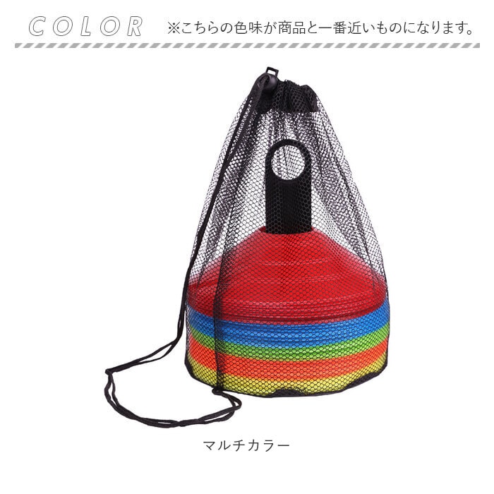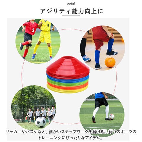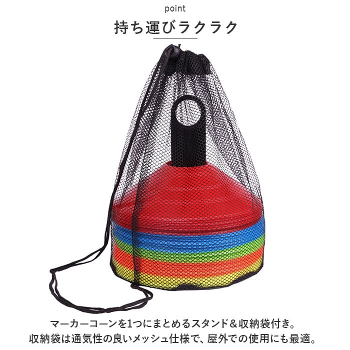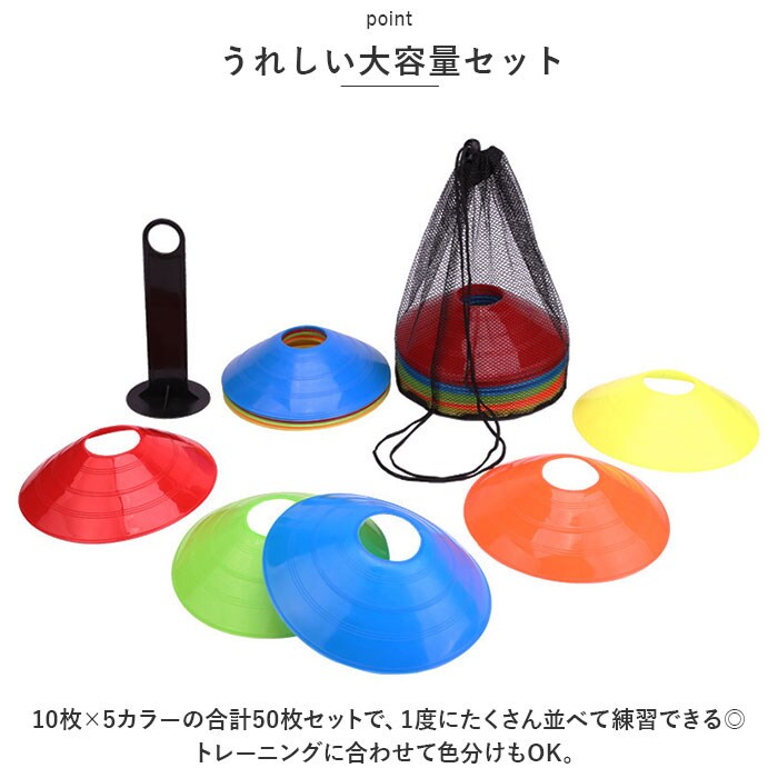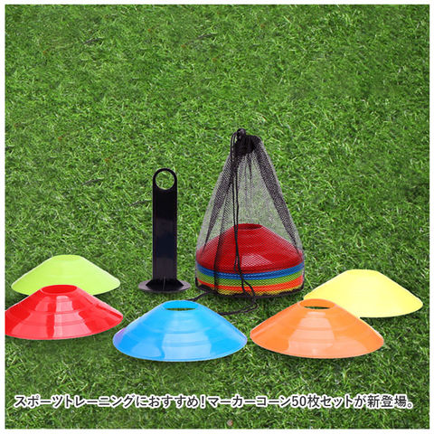 | 商品説明 | スポーツトレーニングにおすすめ!マーカーコーン50枚セットが新登場。【アジリティ能力向上に】サッカーやバスケなど、細かいステップワークを繰り返し行うスポーツのトレーニングにぴったりなアイテム。【うれしい大容量セット】・10枚×5カラーの合計50枚セットで、1度にたくさん並べて練習できる◎トレーニングに合わせて色分けもOK。【壊れにくい安心素材】柔軟性があり軽量なPE素材。誤って踏んでしまっても壊れにくくケガの心配が少ないので、お子さまでも安心して使用可能。【持ち運びラクラク】マーカーコーンを1つにまとめるスタンド&収納袋付き。収納袋は通気性の良いメッシュ仕様で、屋外での使用にも最適。 |