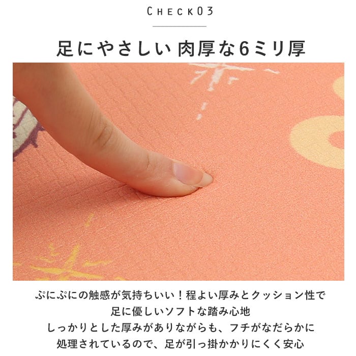 商品説明キャラクターの絵柄が可愛い♪柔らかいPVC素材のロングマット(45cm×240cm)が登場。もちもちとしたクッション性のあるマットで、足への負担を軽減。程よい厚みがあり、床を傷つけにくいのもポイント◎水ハネや油汚れもサッとひと拭きでOK、面倒なお洗濯が不要!布製品と異なりホコリが出ず、糸の間にゴミが入り込むこともないので、掃除機がけもラクチン。裏面は滑りにくいよう加工されており、キッチンでも快適に使用可能◎雑菌の繁殖を抑制する抗菌加工、カビの発生や繁殖を防ぐ防カビ加工済み!防炎性の高い素材なので、万が一マットに着火した際にも燃え広がることがなく安心。