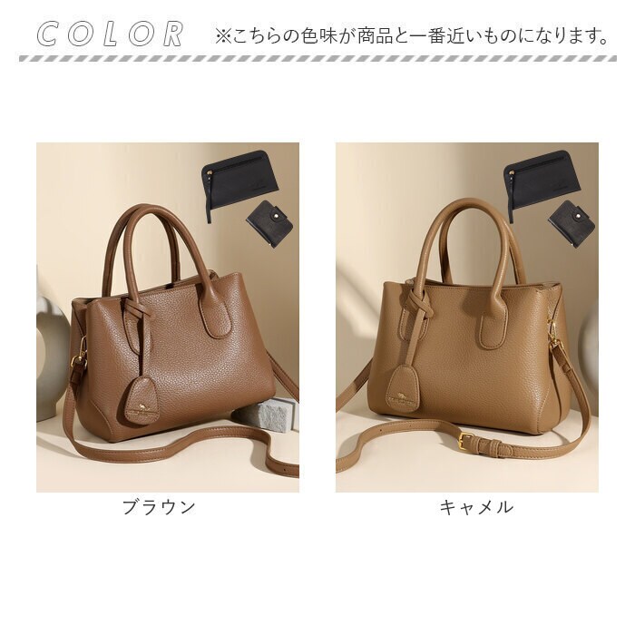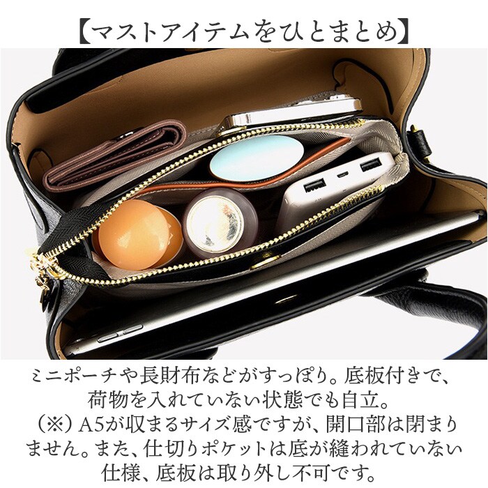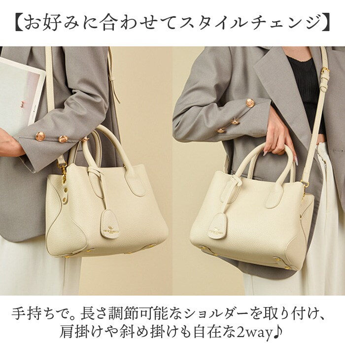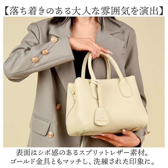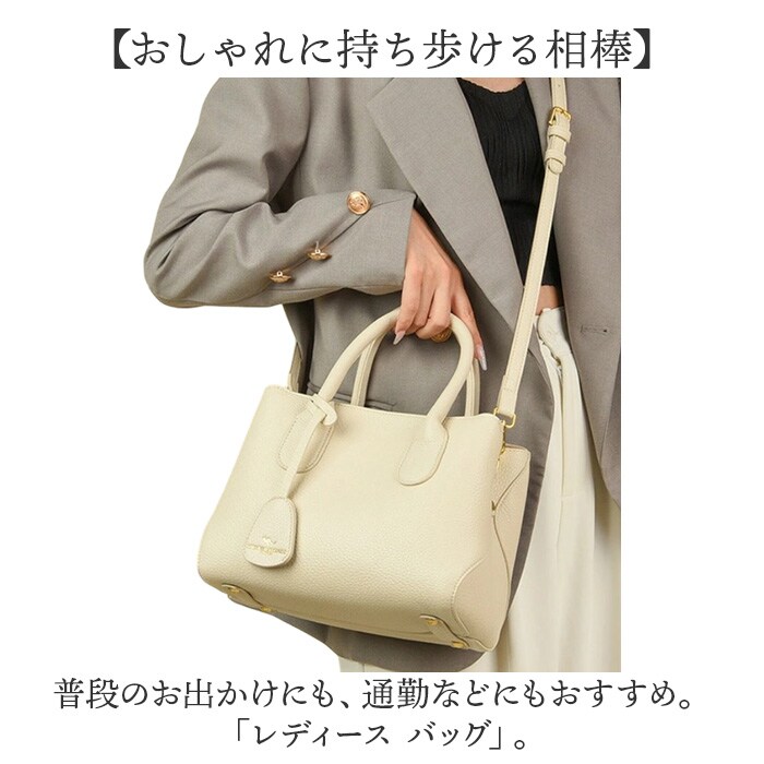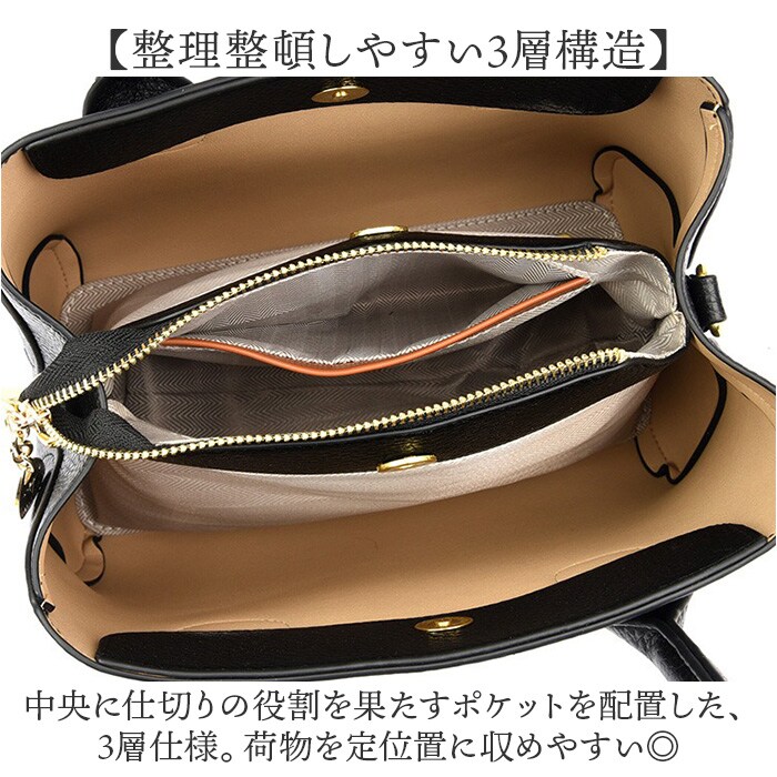 | 商品説明 | 【おしゃれに持ち歩ける相棒】普段のお出かけにも、通勤などにもおすすめ。「レディース バッグ」。【落ち着きのある大人な雰囲気を演出】表面はシボ感のあるスプリットレザー素材。ゴールド金具ともマッチし、洗練された印象に。【お好みに合わせてスタイルチェンジ】手持ちで。長さ調節可能なショルダーを取り付け、肩掛けや斜め掛けも自在な2way♪【整理整頓しやすい3層構造】中央に仕切りの役割を果たすポケットを配置した、3層仕様。荷物を定位置に収めやすい◎【マストアイテムをひとまとめ】ミニポーチや長財布などがすっぽり。底板付きで、荷物を入れていない状態でも自立。(※)A5が収まるサイズ感ですが、開口部は閉まりません。また、仕切りポケットは底が縫われていない仕様、底板は取り外し不可です。【お気に入りを選べるカラー】コーデを選ばず使いやすいカラーをラインナップ。ロゴ入りチャームがアクセント!【ポケット仕様】内側:中仕切りファスナーポケット×1(内側にファスナーポケット×1、オープンポケット×1) |