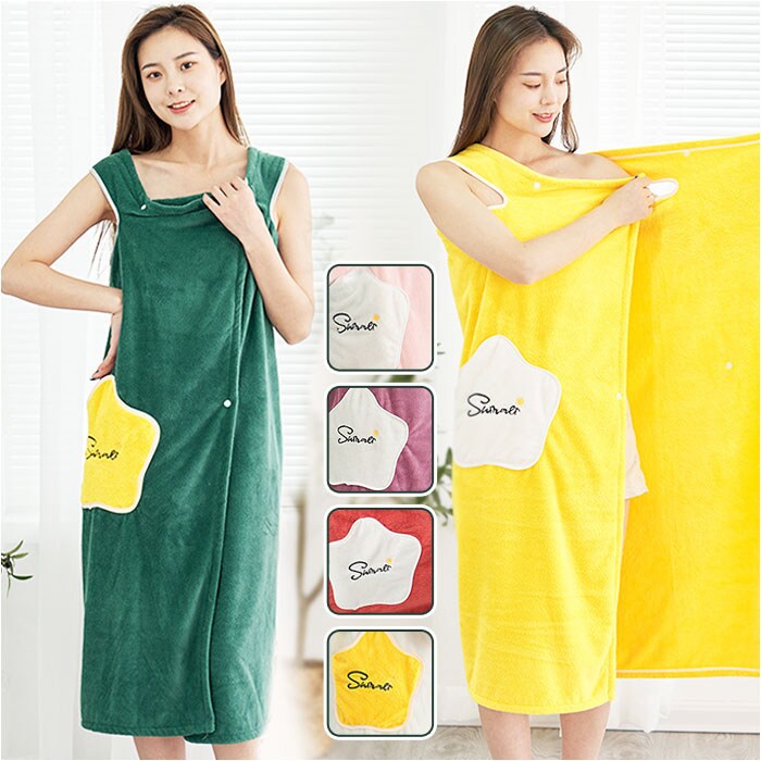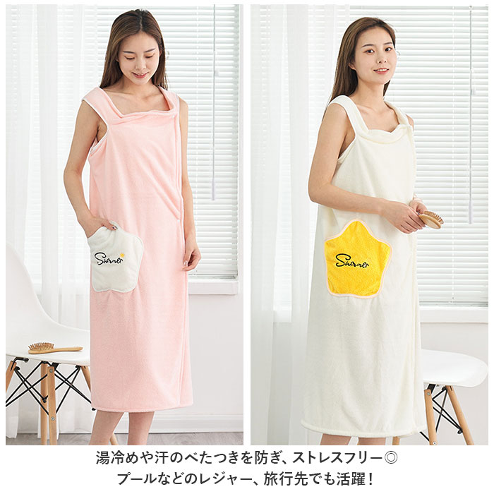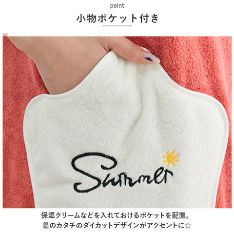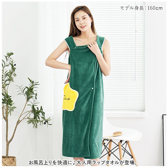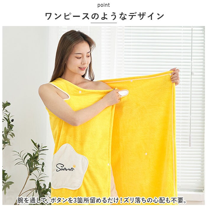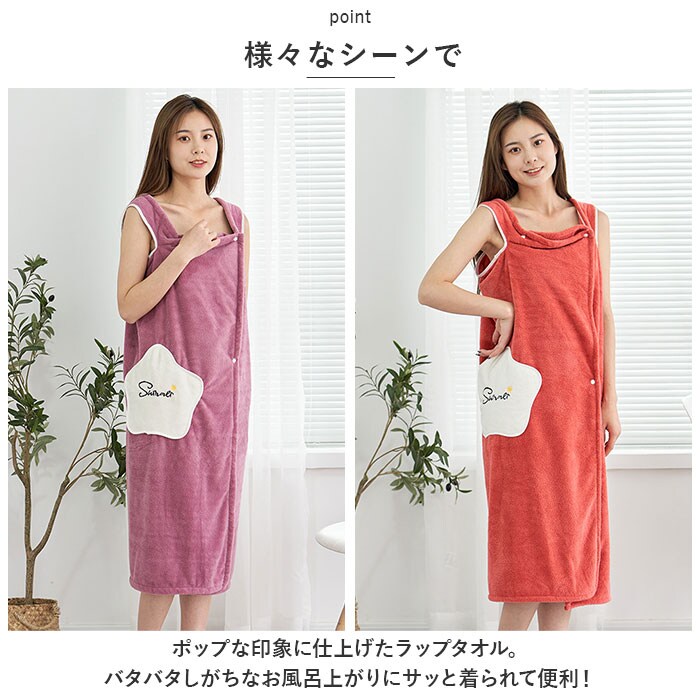 | 商品説明 | お風呂上りを快適に♪大人用ラップタオルが登場。【ワンピースのようなデザイン】腕を通して、ボタンを3箇所留めるだけ!ズリ落ちの心配も不要。【手軽に使える!】バタバタしがちなお風呂上がりに、サッと着られて便利!湯冷めや汗のべたつきを防ぎ、ストレスフリー◎【ふんわり素材】柔らかく、お肌に優しい素材を使用。水気や汗を素早く吸収♪【程よいボリューム感】薄すぎず厚すぎない生地感で使い勝手抜群。【小物ポケット付き】保湿クリームなどを入れておけるポケットを配置。星のカタチのダイカットデザインがアクセントに☆【様々なシーンで】ポップな印象に仕上げたラップタオル。プールなどのレジャー、旅行先でも活躍! |