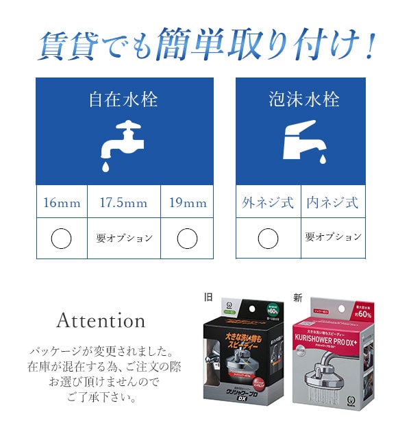 | 注意点 | 【取り付けられない水栓】・外ネジ式泡沫水栓でネジ部口径が23mm以上のもの、モーエン社製内ネジ式泡沫水栓。【付属のアタッチメントでは取り付できない水栓(別売りリングで取り付可能)】(1)丸型で先端にふくらみのない水栓(2)角型・特殊なデザイン・泡沫キャップ付角ネジ型の水栓(3)ヤンマー・モーエン・グローエ(ネジピッチ1.0)社製等の泡沫水栓(4)グローエ・KVK社製で内ネジ式泡沫水栓(5)丸型で先端にふくらみのある口径17.5mmの水栓【注意事項】 ・60度以下でご使用ください。カメラやモニターの性質により、画像と実物の色の違いがある場合がございますのでご理解願います。 |
