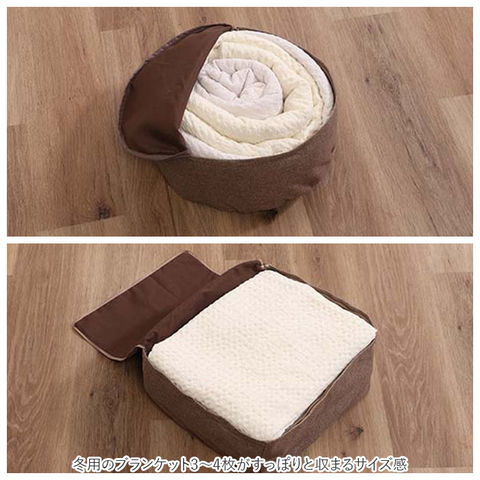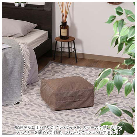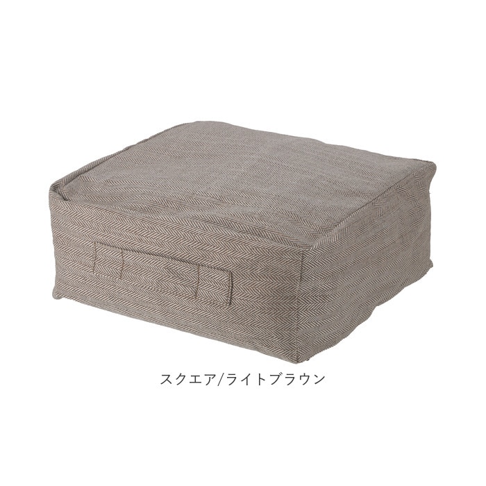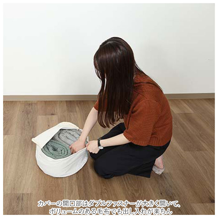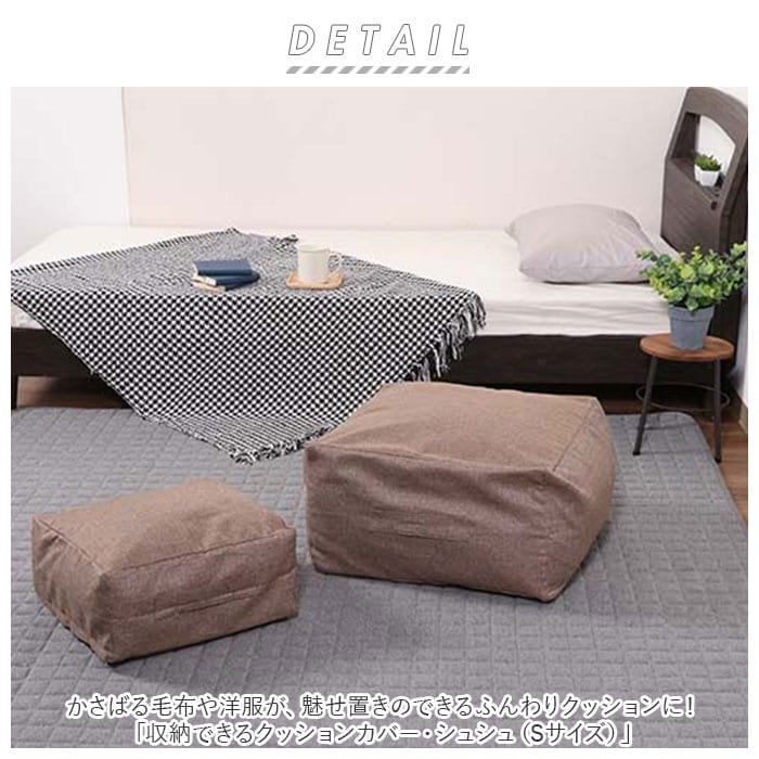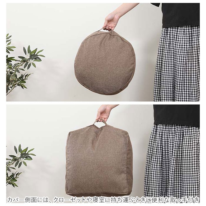 | 商品説明 | かさばる毛布や洋服が、魅せ置きのできるふんわりクッションに!「収納できるクッションカバー・シュシュ(Sサイズ)」収納場所に困っていたブランケットを、カバーの内側に入れてファスナーを閉めるだけで、ふわふわクッションに早変わり!冬用のブランケット3~4枚がすっぽりと収まるサイズ感。カバーの開口部はダブルファスナーが大きく開いて、ボリュームのある毛布でも出し入れが楽ちん。ソファやフローリングの壁際に立て掛ければ、リラックス感のある背もたれクッションに。ローテーブルと合わせて、座椅子にしてもOK!カバー側面には、クローゼットや寝室に持ち運ぶときに便利な取っ手付き。中に詰めるブランケットの種類やボリュームに応じて、お好みの硬さに調節可能。少し硬めに調整すれば、ソファ前で足を載せるオットマンにも♪生地の素材には肌触りのよいポリエステルキャンバス生地を使用。汚れが気になったら、ご家庭で手洗いができるのも嬉しいポイント!コロンと丸いカタチが可愛いラウンド型と、きちんと感のあるインテリアを演出できるスクエア型、お部屋の雰囲気に合わせて選べる2タイプ。 |