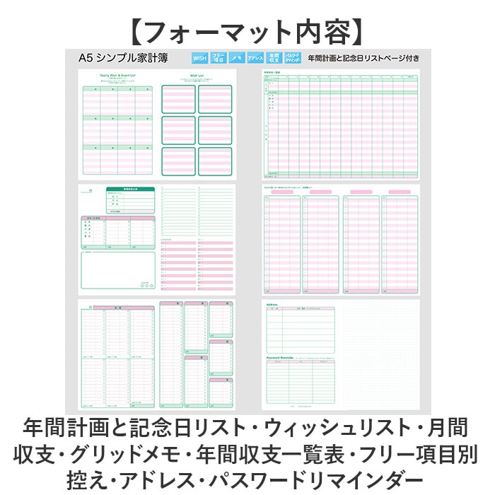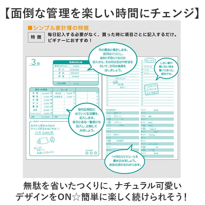 | 商品説明 | 【お金の流れをわかりやすく管理】簡単にざっくり、お金の流れを見える化◎可愛らしいデザインの「A5 シンプル家計簿」。【思い立った日からスタート】日付が書かれていないので、お好きな日から始められる!56ページのフリータイプ家計簿。【節約のヒント探しにぴったり】何にいくら使ったかをひと目で把握!1ヶ月の支出を記入できるシンプルなフォーマット。【家計簿初心者や続かない方も安心】食費以外の費目は自由に設定。食費の項目は1週間単位の集計、その他は項目でまとめるだけ。【年間計画や収支もしっかり記録】夢を叶えるためにしたいことやその費用。年間収支一覧表やパスワードリマインダーも等も。【便利なポケット付きカバー】家計簿の汚れなどをガードするカバー。ファスナーポケット&小物ポケット付き。【面倒な管理を楽しい時間にチェンジ】無駄を省いたつくりに、ナチュラル可愛いデザインをON☆簡単に楽しく続けられそう!【フォーマット内容】年間計画と記念日リスト・ウィッシュリスト・月間収支・グリッドメモ・年間収支一覧表・フリー項目別控え・アドレス・パスワードリマインダー |