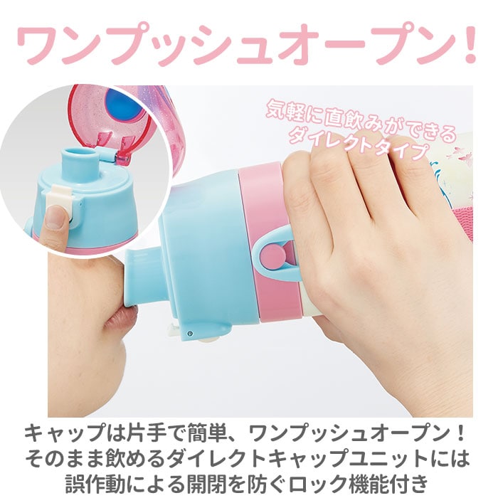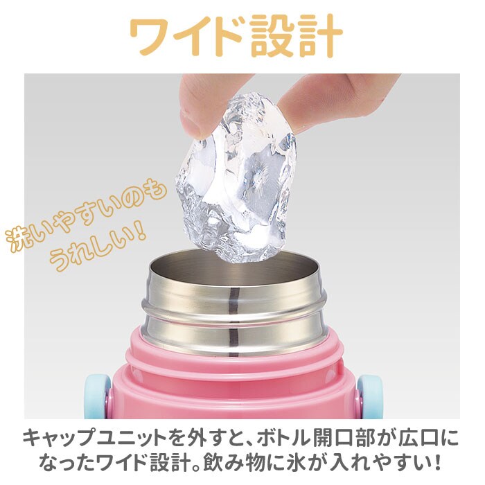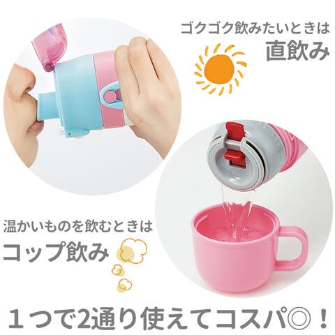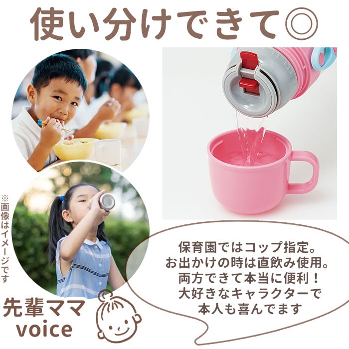 | 商品説明 | 人気キャラクターの柄がかわいい!キャップを替えて使い方2通り。直飲みとコップ飲み、どちらにも対応した2WAYステンレスボトル。飲みたい時にそのまま飲めるキャップユニットで、気軽に直飲みができるダイレクトタイプ。遠足や運動会など、のどの渇きをすぐに癒したい時にぴったり。キャップは、ワンプッシュで簡単オープン!誤作動による開閉を防ぐロック機能付き。さらに、飲み物を飲むときに、キャップが倒れてこないキャップロック機能付きで、ごくごく直飲みする時もキャップが顔に当たらない♪コップ飲み専用のキャップユニットに交換すれば、スタンダードなコップに飲み物を注ぐタイプのボトルに変身!(コップ飲み専用キャップユニットでご使用時には、冷たい飲み物と温かい飲み物、どちらでもご使用いただけます。)キャップユニットを外すと、ボトル開口部が広口になったワイド設計で、飲み物に氷が入れやすい。真空二重構造で、保冷効果もしっかり長持ち。(※)付属のショルダーベルトにはネームプレート付きで、お友達のボトルとの取り違えが防げる♪遠足やピクニックに出かける時もお子さまご自身で持ち運びしやすい、軽量コンパクト設計。トイストーリー4やすみっコぐらしなど、お子さまに人気のキャラクターの絵柄で、好きなデザインがきっと見つかる!※本商品はダイレクトタイプのキャップユニットを使用する際には、保冷専用です。ダイレクトタイプでご使用時は熱い飲み物を入れてご使用にはなれませんのでご注意ください。 |
