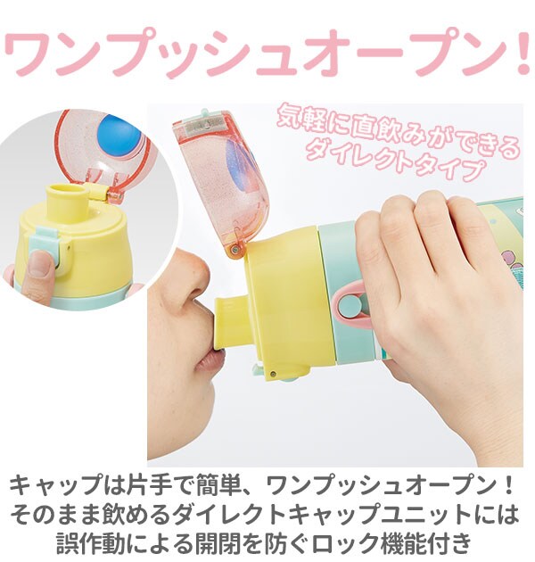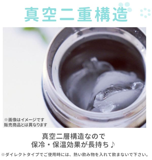 | 注意点 | ダイレクト飲みの際は保冷専用です。熱いものを入れて飲まないでください。火のそばに置かないでください。自動食器洗い洗浄機、食器乾燥機は使用しないでください。煮沸消毒は使用しないでください。電子レンジは使用しないでください。ボトルは立てた状態でご使用ください。横にすると、水濡れする場合があります。直射日光のあたる場所に長時間放置しないでください。キャップ、フタは最後までしっかりと閉めてください。カメラやモニターの性質により、画像と実物の色の違いがある場合がございますのでご理解願います。 |