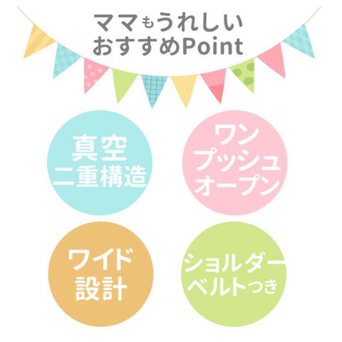 | 商品説明 | ステンレス製でキャップを変えて直飲みにも、コップ飲みにも使える2Wayタイプ♪直飲みは、ワンプッシュで簡単にオープンできるので、片手が塞がっていても大丈夫です。誤作動によるキャップの開閉を防ぐロック機能付きで中身が簡単にこぼれるのを防ぎます。氷が入れやすい広口タイプです。また、ショルダーベルトにネームプレート付きなので、肩から掛けられて、両手が使えます。また、迷子になりにくいのもいいですね。 |