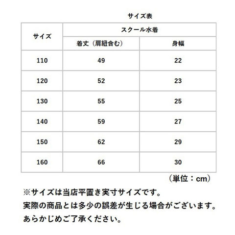 | 注意点 | 砂が繊維の間に入り込むと、黒ずんで大変目立ちます。入り込んだ砂は取りにくいので、砂遊びはお避けください。プールの滑り台での強い摩擦は生地をいためますのでご注意ください。色柄によって紫外線の吸収が異なり、お肌に柄が日焼けする場合があります。日焼けオイル類は水着をいためる場合があります。付着した場合は後でよく洗濯してください。濡れたままビニール袋に密封し、長い時間放置しますと色移りすることがありますのでご注意ください。洗濯は水、またはぬるま湯で押し洗いし、型を整えて陰干ししてください。乾燥機のご使用はおさけください。生地素材はプールの消毒液の温度によって色落ちする場合があります。カメラやモニターの性質により、画像と実物の色の違いがある場合がございますのでご理解願います。 |