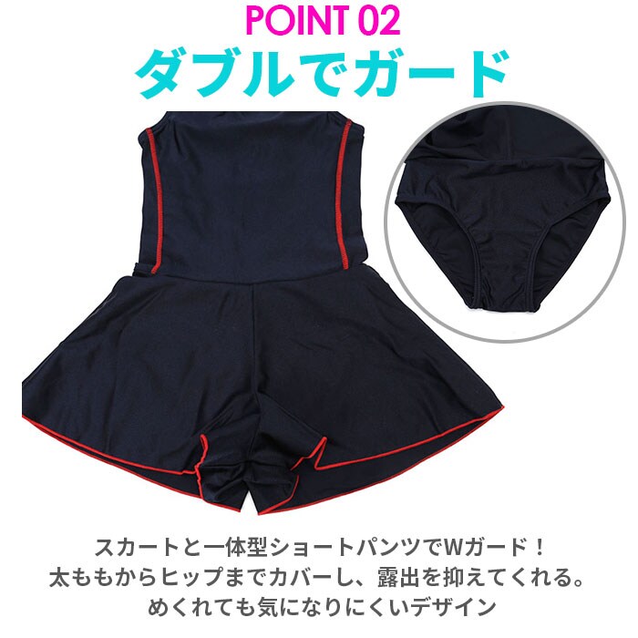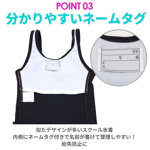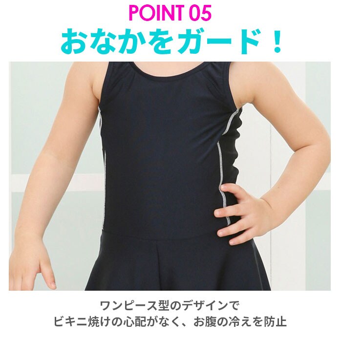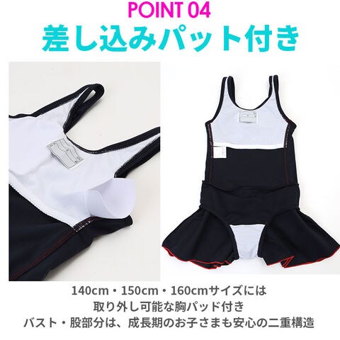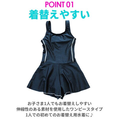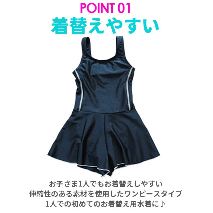 | 商品説明 | シンプルなデザインで使いやすい、スクール水着(ワンピースタイプ)が発売。お子さま1人でもお着替えしやすい、伸縮性のある素材を使用したワンピースタイプ。スカートと一体型ショートパンツでWガード!ビキニ焼けの心配がなく、お腹の冷えを防止。ふわっと広がるスカートで、ヒップラインをおしゃれに隠せるのが嬉しい◎バスト・股部分は、成長期のお子さまも安心の二重構造。140cm・150cm・160cmサイズには取り外し可能な胸パッド付きで、バストを優しくカバー。内側にネームタグ付きだから、お友達とお揃いでも大丈夫。ネイビーベースに、上半身のサイドやスカート裾部分に施されたライン使いがアクセント。学校の授業やプール教室、レジャーで活躍。 |
