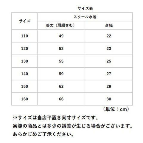 | 注意点 | 砂が繊維の間に入り込むと、黒ずんで大変目立ちます。入り込んだ砂は取りにくいので、砂遊びはお避けください。プールの滑り台での強い摩擦は生地をいためますのでご注意ください。色柄によって紫外線の吸収が異なり、お肌に柄が日焼けする場合があります。日焼けオイル類は水着をいためる場合があります。付着した場合は後でよく洗濯してください。濡れたままビニール袋に密封し、長い時間放置しますと色移りすることがありますのでご注意ください。洗濯は水、またはぬるま湯で押し洗いし、型を整えて陰干ししてください。乾燥機のご使用はおさけください。生地素材はプールの消毒液の温度によって色落ちする場合があります。商品の写真はできる限り実物のお色に近づけるように加工しておりますが、お使いのモニター設定、お部屋の照明などにより、実際の商品と異なる場合がございます。商品や個体差などにより、表記と若干異なる場合がございますが、予めご了承くださいませ。輸入品のため、糸の継ぎ目や縫製等が甘い部分、糊跡等が生じる場合がございますが、予めご了承くださいませ。生地の特性上、やや匂いが強く感じられるものもございます。数日のご使用や陰干しなどで気になる匂いはほとんど感じられなくなります。配送の方法によっては、商品に多少のシワ等ができる場合がございますが、出来る限りお客様にリーズナブルな価格帯でご提供するためです。ご了承くださいませ。採寸方法の違いにより、多少の誤差がある場合がございます。 |