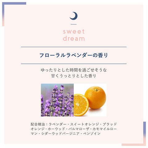 | 商品説明 | 天然アロマの香りで、1日頑張った自分によい眠りのご褒美を♪お休み前にいつもの香りで入眠儀式、SLEEP STEPのアロマティックピローミスト。眠りとお風呂の専門家、小林麻利子さん監修。独自の睡眠メソッドを採用した「SLEEP STEP」シリーズは、入浴から睡眠までの時間をトータルサポート!アロマティックピローミストは、心地よいおやすみへのステップ3。すやすやタイムにぴったり♪お休み前に枕やお布団、カーテンにスプレーするだけ。空間に使用してもOK。植物の恵みである天然精油のみを厳選!アロマセラピストがバランスよくブレンドした香りは自分のスイッチをオンからオフへと導き、心も体も整えてくれる◎鉱物油・パラベン・シリコンフリー。無着色、合成香料不使用!別ページのアロマティックバスミルク(sleepstep1)とアロマティックボディオイル(sleepstep2)を合わせて使うと、より効果的!・【ラインナップ】スイートドリーム…ゆったりとした時間を過ごせそうな甘くうっとりとした、フローラルラベンダーの香り。クリアビューティー…思わず深呼吸したくなるような、すっきりとして落ち着いた、ハーバルベルガモットの香り。 |