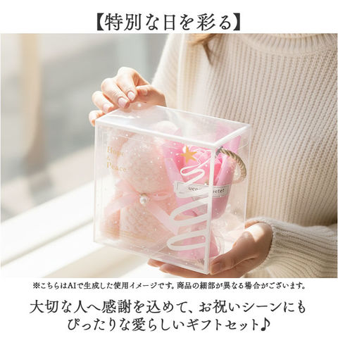 | 商品説明 | 【愛らしさ満点ギフトセット】お花とクマが奏でる、心温まる贈り物の新定番!【特別な日を彩る】大切な人へ感謝を込めて、お祝いシーンにもぴったりな愛らしいギフトセット♪【枯れない美しさが続く花】石鹸で作られた観賞用ソープフラワーで、手入れ不要で長く楽しめる優れもの◎【ほどけば実用的なハンカチに】リボンをほどくとふわふわ肌触りのタオルハンカチに変身、飾って使える二役仕様〇【届いた瞬間から喜ばれる】ギフトボックス入りで、そのまま渡せる特別感のあるパッケージデザイン! |