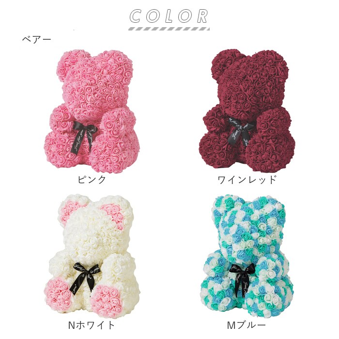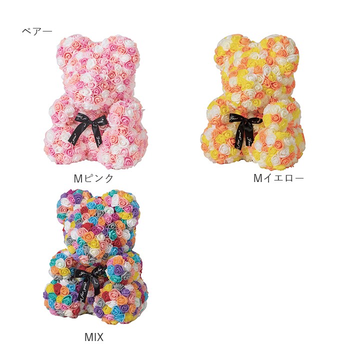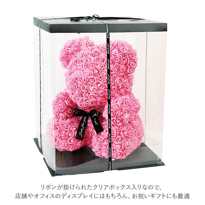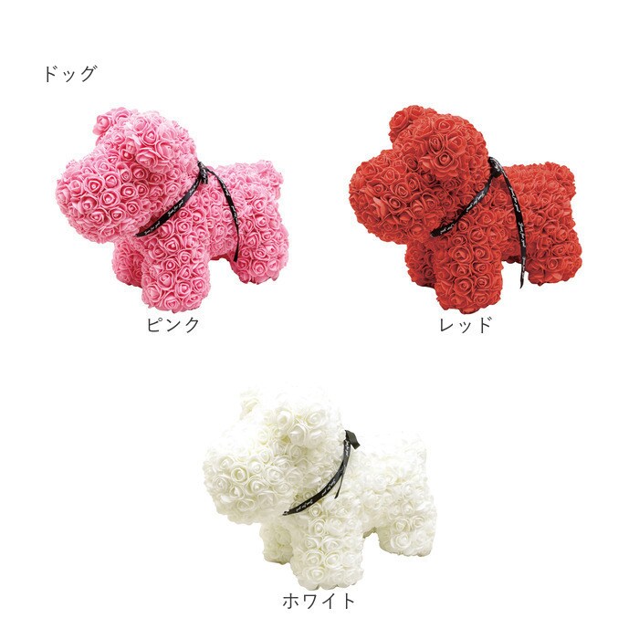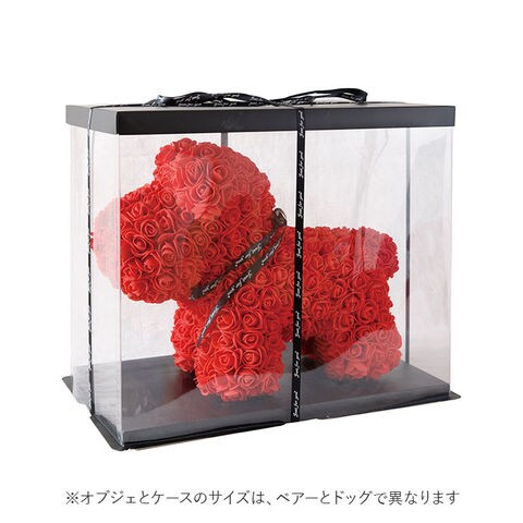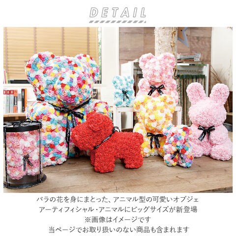 | 商品説明 | バラの花を身にまとった、アニマル型の可愛いオブジェ。アーティフィシャル・アニマルにビッグサイズが新登場。ちょこんとお座りしたクマさんと、今にも歩きだしそうなワンちゃんの置物をエレガントなバラの花で可愛くデコレーション。カラフルなバラの花びらにはEVA樹脂素材使用し、まるで砂糖菓子のような繊細な質感を表現。一般的な造花やプリザーブドフラワーに比べて、丈夫で鮮やかな色彩が長持ち。リボンが掛けられたクリアボックス入りなので、店舗やオフィスのディスプレイにはもちろん、お祝いギフトにも最適。その愛くるしいルックスと抜群の存在感で、パーティーやセレモニー、お祝いの席に飾れば、会場がよりいっそう華やかな雰囲気に。ベアーとドッグ、どちらのアニマルもお気に入りのカラーが選べちゃう♪(※オブジェとケースのサイズは、ベアーとドッグで異なります。)予備のお花パーツ×3が付属。 |