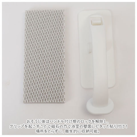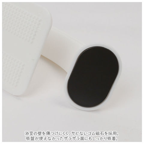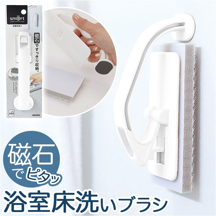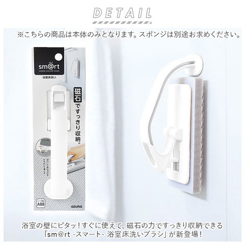 | 商品説明 | 浴室の壁にピタッ!すぐに使えて、磁石の力ですっきり収納できる「sm@rt -スマート- 浴室床洗いブラシ」が新登場!おそうじ後は、グリップの先端についた磁石で、ユニットバスの壁にピタッと貼りつけられる画期的な浴室床洗い専用ブラシ。水に濡らしてこするだけで、ツンツンブラシが浴室床の凹凸ミゾに入り込み、ヌメリやピンク汚れもスッキリとかき出してOFF!柔らかなナイロン毛のブラシなので、床を傷つける心配がなく、洗剤も不要。握りやすいグリップ一体型構造だから、軽い力で広い床面もラクラクおそうじ。おそうじ後はハンドル付け根のロックを解除し、グリップを起こすことで磁石の力で浴室の壁面にピタッと貼り付け!場所をとらずに、衛生的に収納可能。浴室の壁を傷つけにくく、サビないゴム磁石を採用。吸盤が使えなかったザラザラ面にもしっかり吸着。(※鋼板を使用していない壁、タイル、木、大きな凸凹のある壁、ガラス等にはご使用いただけません。)ブラシスポンジの交換は、面ファスナー式でとっても簡単!(※スポンジの白色面とグリップの裏側の面ファスナーでしっかりと貼り付きます。)専用スペアスポンジは、別商品ページでご購入が可能。(※ストアの検索窓に、英数字の商品コード「smartsqa88」を入力して検索してください。)サッとスムーズに「しまえる」!シンプルでいつでも「使いやすい」!「sm@rt」は、人とものとの距離を縮め、効率の良いスマートな暮らしをご提案するシリーズ。 |