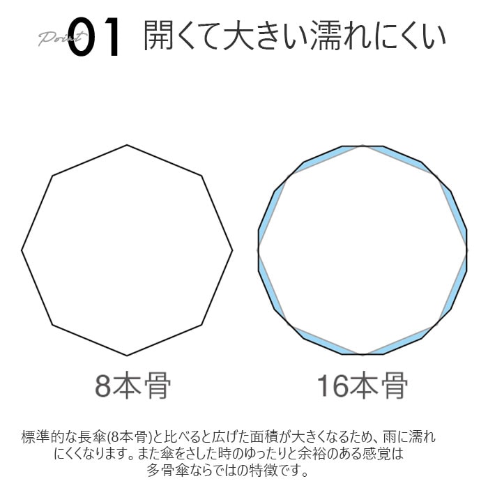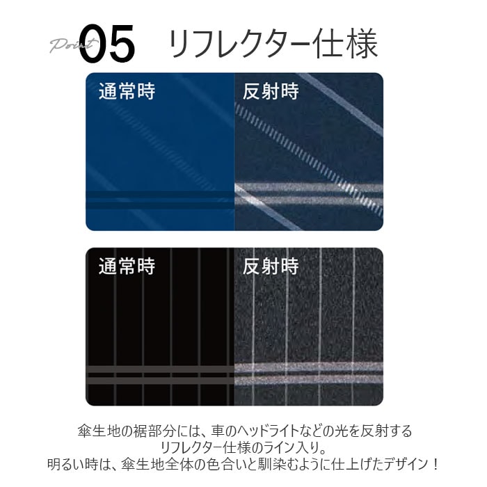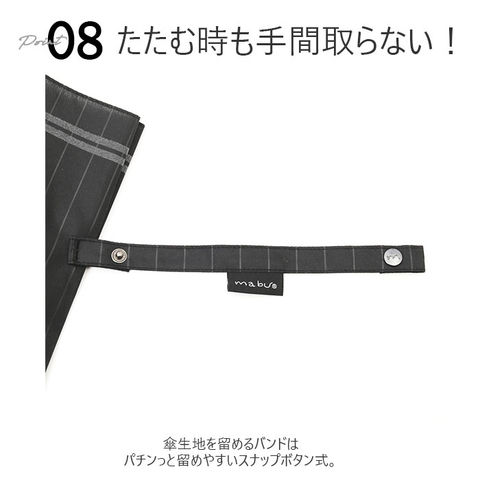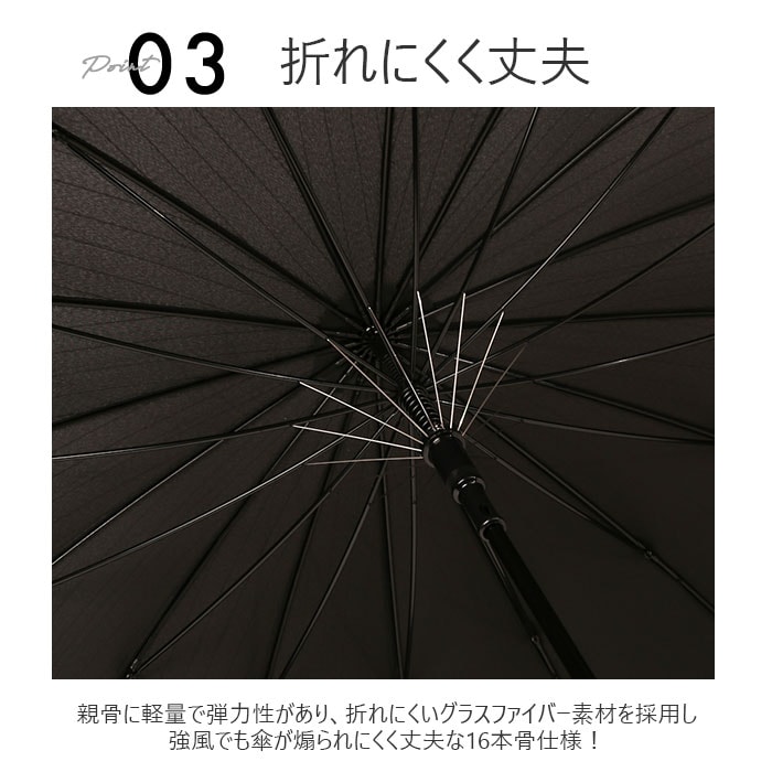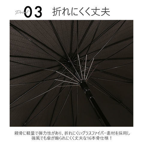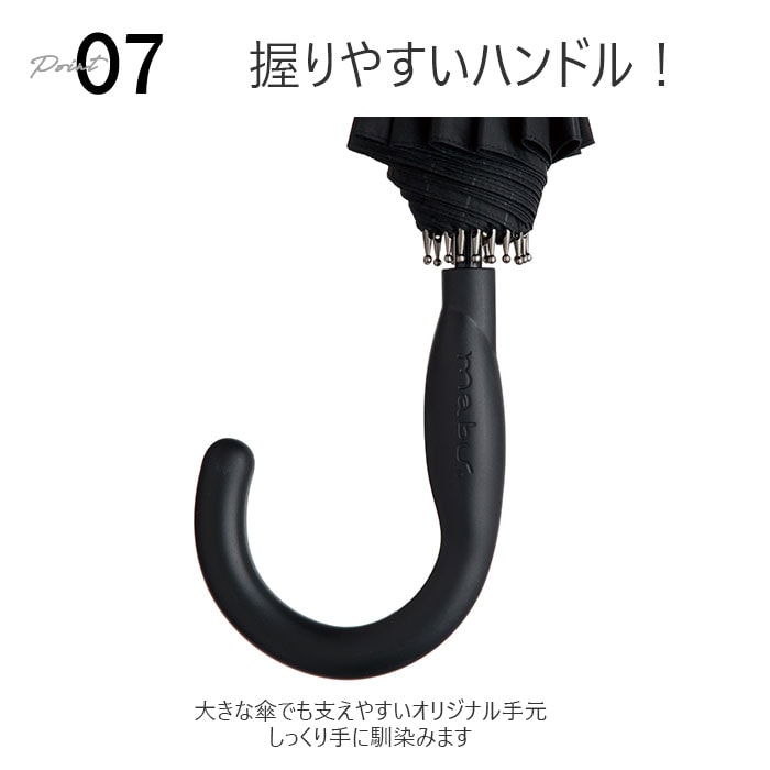 | 商品説明 | mabu(マブ)から、雨風に負けない16本骨傘「ベーシック ジャンプ 16 Biz」が登場。(親骨65cmタイプ)親骨に軽量で弾力性があり、折れにくいグラスファイバー素材を採用し、強風でも傘が煽られにくく丈夫な16本骨仕様!さらに親骨65cmと面積が大きいから、雨に濡れにくい◎片手でサッと開きやすいジャンプ式。手荷物を持っている時でもワンタッチで簡単開閉。傘生地を留めるバンドは、パチンっと留めやすいスナップボタン式。傘生地の裾部分には、車のヘッドライトなどの光を反射するリフレクター仕様のライン入り。明るい時は、傘生地全体の色合いと馴染むように仕上げたデザイン!紫外線遮蔽率は90%以上!雨の日だけでなく日差しの強い日も使える晴雨兼用タイプ。多骨傘ならではの丈夫さや余裕の感じられるサイズ感、大きな傘でも支えやすく設計されたハンドルデザインもポイント◎デザインと機能性を追求した長傘は、日常使いはもちろんビジネスシーンでも活躍。 |