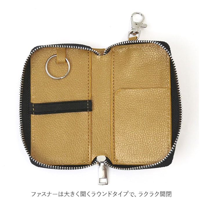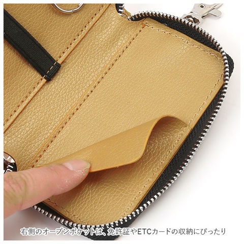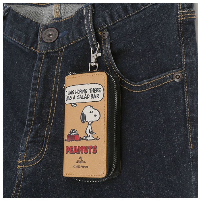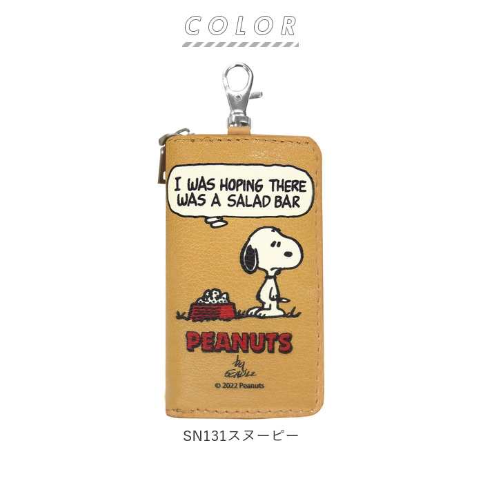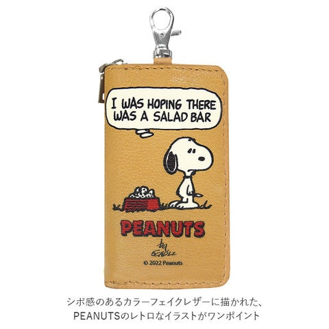 商品説明ヴィンテージ感のある絵柄が可愛い!キャラクタースマートキーケースに少し大きめLサイズが新登場。ファスナーは大きく開くラウンドタイプで、ラクラク開閉。ケース内部に自動車のスマートキー(キーレスキー)がちょうど収まるサイズ。内側のリングにスマートキーを取り付けることで、スマートキーの紛失や落下の防止に!ゴムバンドで小さめのスマートキーもしっかり安定。自宅の鍵や自転車の鍵をキーリングに取り付ければ、通常のキーケースにもなる便利仕様。右側のオープンポケットは、免許証やETCカードの収納にぴったり!360度回転するカラビナで、バッグの持ち手やショルダーベルト、パンツのベルトループに取り付け可能!シボ感のあるカラーフェイクレザーに描かれた、PEANUTSのレトロなイラストがワンポイント。
