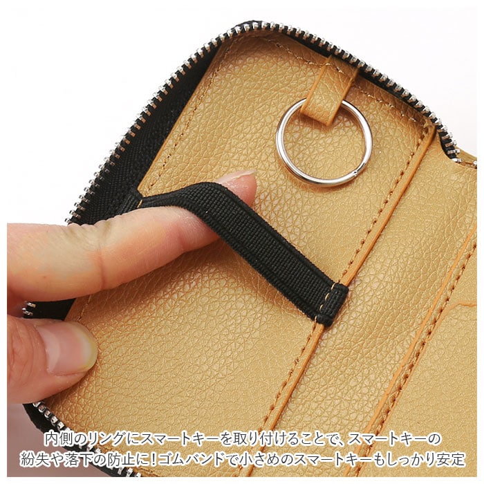注意点本品サイズを参考に収納可能かお確かめください。ケースより大きいサイズのスマートキー・カードを収納しないでください。収納物や本品が破損する恐れがあります。スマートキーの紛失を防ぐため、本品内側のリングにスマートキーを取り付けて使用してください。スマートキーと通常の鍵を一緒に収納すると、スマートキーにキズが付いたり、破損する恐れがあるため、おやめください。小さいサイズのスマートキーを収納する場合は、本品内側のゴムベルトにスマートキーを通してご使用いただくと、スマートキーが安定します。使用する際に、きちんと装着されているか、本品が破損していないか確認してください。過度な力で引っ張ると破損の原因となりますので注意してください。使用状況によっては、素材の特性上、時間の経過と共に空気中の湿気や紫外線等により劣化します。素材の特性上、水分が付着すると劣化が早まる可能性がありますので、水気には注意してください。濡れた場合は速やかに水分を拭き取ってください。雨や水滴で濡れた状態での使用、及び、濡れたままの長時間放置は、色移り、色落ちの可能性がありますので注意してください。本品は日光や紫外線により、色落ち・変色する場合がありますので注意してください。本品は摩擦によって色落ちする可能性がありますので注意してください。本品は洗濯出来ません。汚れた時は水、または中性洗剤につけた布をかたく絞り拭いてください。磁気の強い物を収納すると、スマートキーやカード類が破損する恐れがありますので、おやめください。走行中、本品の脱着は大変危険ですのでおやめください。仕様及び外観は改良のため予告なしに変更することがあります。カメラやモニターの性質により、画像と実物の色の違いがある場合がございますのでご理解願います。
