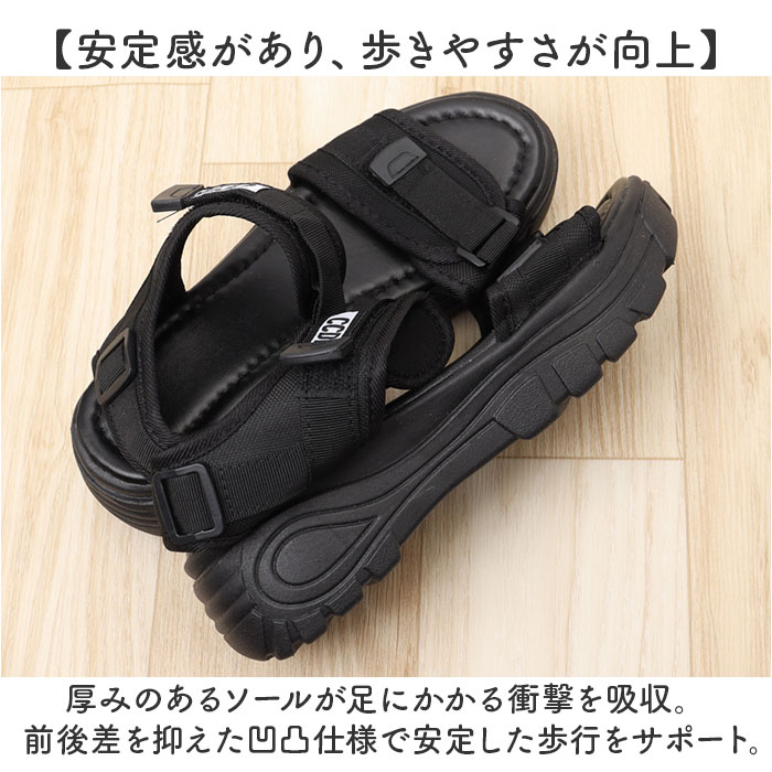 | 商品説明 | 【足元すらりとキレイ魅せ!】履くだけで身長がアップする厚底仕様☆「レディースサンダル」が新登場。【シンプルなスポーティールックス】カジュアルコーデに馴染む、スポーティーデザイン。学生さんにもおすすめ!【締め付けを感じず自分サイズに】・2箇所のベルトは面ファスナー式。足のカタチに合わせて微調整でき、抜群のフィット感◎【汗ばむ季節もサラッと快適】つま先が開いたオープントゥデザイン。全体的に開放感があり、真夏でもムレにくい!【安定感があり、歩きやすさが向上】厚みのあるソールが足にかかる衝撃を吸収。前後差を抑えた凹凸仕様で安定した歩行をサポート。【コーデを選ばないカラーリング】ブラックベースで落ち着きのあるカラー。夏のお出かけの相棒に♪ |