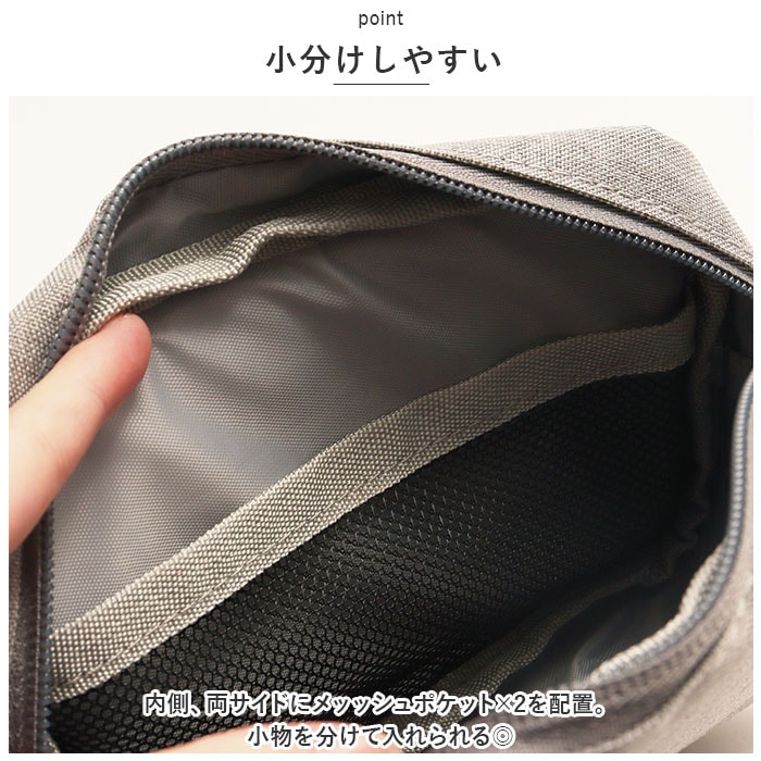 | 商品説明 | シンプルで持ち運びに便利な収納ポーチが発売。【ちょうどいいサイズ】必要な物だけを入れられる普段使いにピッタリなサイズ感◎マチ付きなので収納力も抜群。【小分けしやすい】内側、両サイドにメッッシュポケット×2を配置。小物を分けて入れられる◎【はっ水加工】はっ水加工が施されているので、イヤホンやモバイルバッテリーなどガジェット類を入れても◎【MサイズとLサイズ】Mサイズ、Lサイスの2種類あり、カラーバリエーションも豊富。サイズ違いや色違いで揃えるのもおすすめ。 |