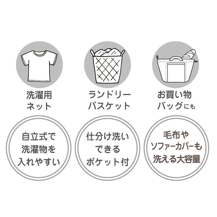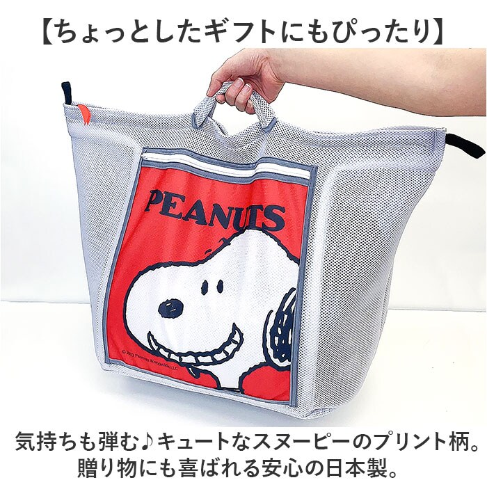 | 商品説明 | 【入れる・洗う・干すがこれ1つ!】入れ替えの手間が省けて、洗濯がラクに♪スヌーピーデザインの「自立するランドリーバッグ」。【ランドリーバスケットのように自立】ネット両サイドに入ったウレタンが、しっかり支えて自立。洗濯物をポイポイ入れられる♪【バスケットから洗濯ネットに変身】バスケットのファスナーを閉めれば洗濯ネットに。衣類を優しく洗い上げるダブルメッシュ素材。(※1)ドラム式やななめ式洗濯機には使用できません。【たっぷり入る大容量サイズ】Lサイズセーター約4~5枚、バスタオル約6~7枚、毛布約2~3枚収納できる大きさ。(※2)洗う物の材質や厚み、サイズなどにより異なります。【小さなアイテムを入れるポケット】ハンカチや靴下などの小物を、仕分けできるポケット。キャラクター柄入りでキュート☆【持ち運びもスマートな持ち手付き】洗濯機から干場、自宅からランドリーなど!サッと手に取って移動しやすいつくり。【たたんで隙間にすっきり忍ばせる◎】折りたたむと厚み約2cmのスリムサイズ◎デッドスペースを有効活用。【ワンタッチでピタッと壁面収納】洗濯機側面等に貼れるキャッチフック付き。凹凸がないので邪魔にならず、繰り返し使用OK。(※3)壁面などにフックを装着し、ランドリーバッグのループをピタッと貼り付けてください。【ちょっとしたギフトにもぴったり】気持ちも弾む♪キュートなスヌーピーのプリント柄。贈り物にも喜ばれる安心の日本製。 |