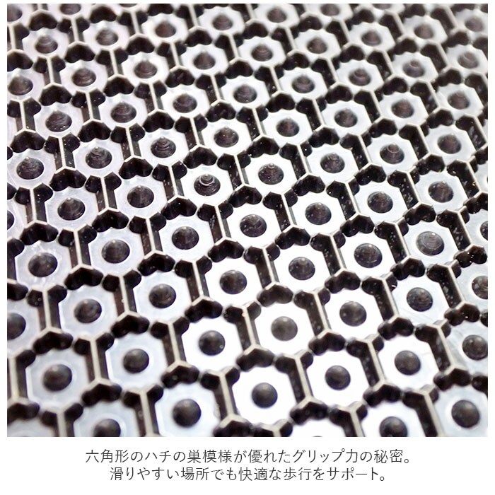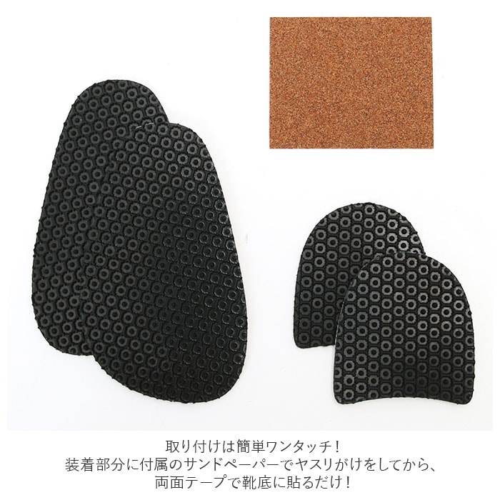 | 商品説明 | 靴底に簡単装着!ステッカータイプの滑り止めラバー「ワンタッチスノーソール&ヒールセット」が登場。六角形のハチの巣模様が優れたグリップ力の秘密。滑りやすい場所でも快適な歩行をサポート。雪道、地下街のフロア、階段、坂道、つるつるの床など、ヒヤッとする場所でもこれならOK!滑り止め対策としてはもちろん、革の靴底の摩耗防止にも効果的。お気に入りの靴を長く大切に履きたい方にオススメ。取り付けは簡単ワンタッチ!装着部分に付属のサンドペーパーでヤスリがけをしてから、両面テープで靴底に貼るだけ!滑り止めパターンが均一なので、靴底の大きさに合わせてカットすれば、小さなカカトにもフィット。安心の日本製。男女兼用で使えるのも嬉しいポイント。 |