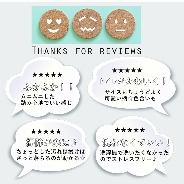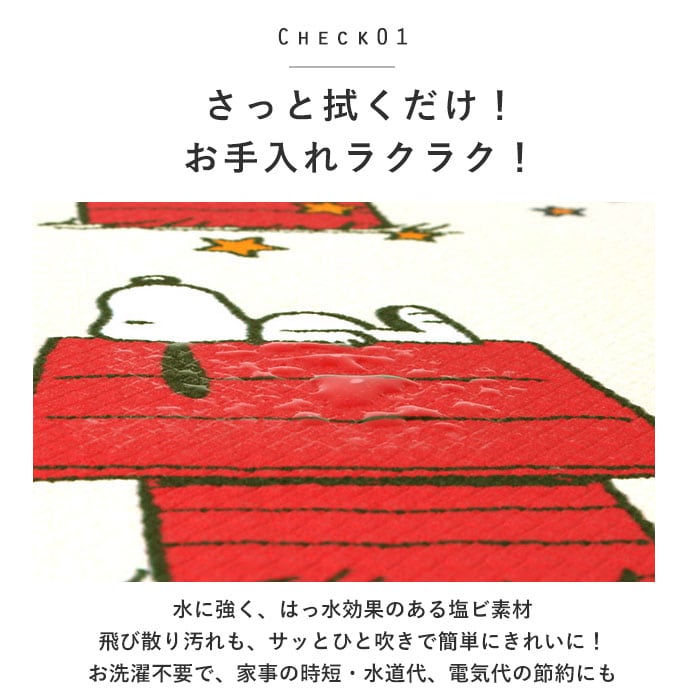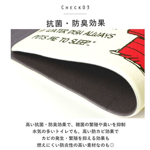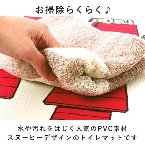| 商品説明 | ささっと拭くだけでお手入れ簡単!フレンドリーなスヌーピー柄がプリントされた「拭けるトイレマット」が発売♪素材は踏み心地やわらかなPVCを採用。布製品と違いほこりが出ず、糸の間にゴミが入り込むこともないので掃除機がけが楽ちん!また、表面につなぎ目や縁取りがないのも特徴。どこにも汚れが溜まらないので、いつも清潔に使えるのが嬉しい。水や汚れに強い素材なので、汚れたときは布ですぐに拭き取ればOK!面倒なお洗濯とはもうサヨナラ♪抗菌・防臭効果で雑菌の繁殖や臭いを抑制。カビの発生・繁殖を抑える防カビ効果も!さらに燃えにくい防炎性の高い素材のため、万が一マットに着火した際にも燃え広がることがなく安心。マットの裏面はすべりにくい加工済みで、マットのずれを直す手間もナシ! |