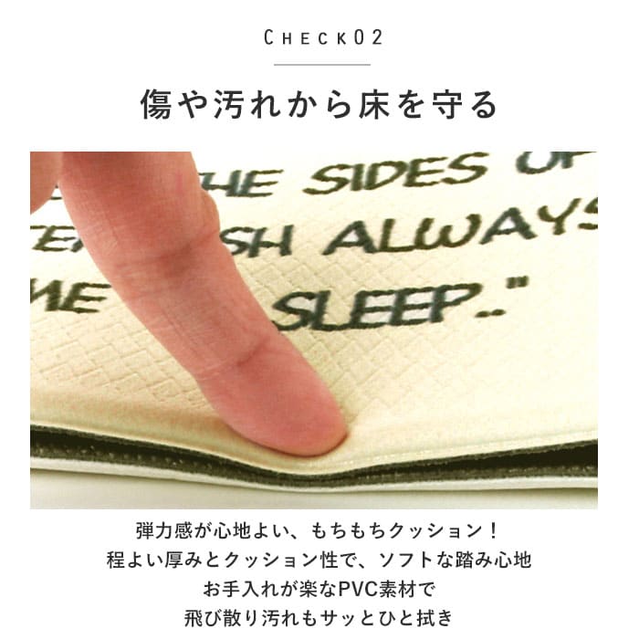 | 注意点 | 塩化ビニルには特有のにおいがあります。特に最初はにおいが強い場合がありますので、ご使用前に風通しの良い場所で1日~2日ほど陰干しされることをおすすめします。水などをこぼされた場合は、乾いた布ですぐに拭き取ってください。また、洗濯することができませんので、汚れがひどい場合は、中性洗剤を含ませた布で汚れを拭き取った後に軽く水拭きをし、最後に乾いた布で拭いてください。アルコールや次亜塩素酸での拭き取りは、色落ちやシミの原因となる可能性がありますので使用しないでください。マットに飛び乗ると、すべってけがをすることがありますので、飛び乗らないでください。床面が濡れているとマットがすべることがありますので、必ず拭き取ってください。ワックスやコーティングされている床面に敷く場合、床面が濡れているとマットが床に付着することがありますので、床が乾いてから使用してください。同じ場所に長期間敷きっぱなしにすると、マットが床に付着することがありますので、一週間に一度はマットを取り除いてください。高温のものを直接マット上に置かないでください。また、ストーブの火や高温の熱を発するものをマットに近づけないでください。マットの上に長期間ゴム製品を置くと変色することがありますので、注意してください。直射日光に長時間当たると、色が変色することがありますので、注意してください。カメラやモニターの性質により、画像と実物の色の違いがある場合がございますのでご理解願います。 |