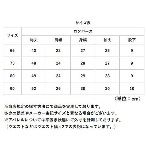 | サイズ | [ベビー] ・66cm ・73cm ・80cm ・90cm ※サイズについて詳細は、商品画像の中にあるサイズ表をご覧くださいませ。 |