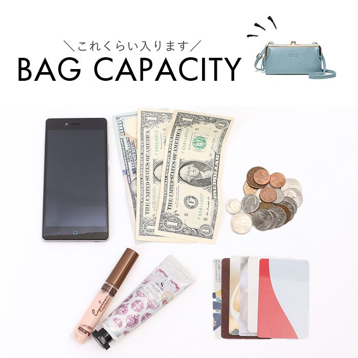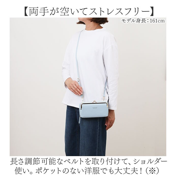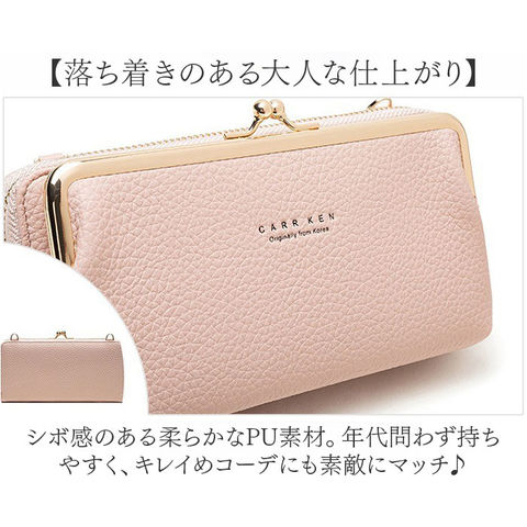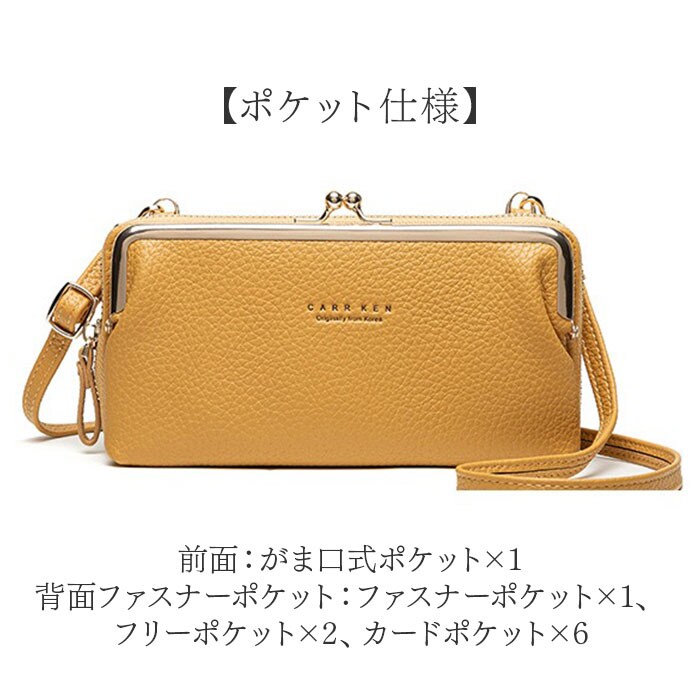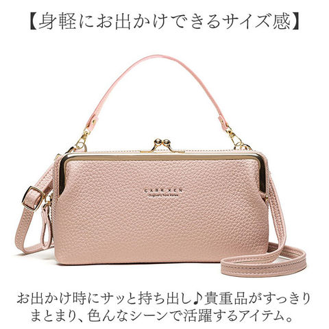 | 商品説明 | 【これ1つでお出かけできる♪】ミニマルスタイルにおすすめ!嬉しいお財布機能付きの、横型ミニバッグ。【身軽にお出かけできるサイズ感】お出かけ時にサッと持ち出し♪貴重品がすっきりまとまり、色んなシーンで活躍するアイテム。【スマホを収納できるがま口ポケット】前面ポケットはデザインのアクセントになる、がま口タイプ。スマホをすっきり収納◎【開閉スムーズ、安心のファスナー式】背面ポケットはラウンド型に大きく開き、中身を一目で確認。閉じればセキュリティ面も安心。【現金やカードも一緒に収納OK】内側にはお札と小銭、カードなど最低限の現金が収納できるポケット付き。【両手が空いてストレスフリー】長さ調節可能なベルトを取り付けて、ショルダー使い。ポケットのない洋服でも大丈夫!(※)ショルダーベルトを取り外して、バッグインも可能です。【落ち着きのある大人な仕上がり】シボ感のある柔らかなPU素材。年代問わず持ちやすく、キレイめコーデにも素敵にマッチ♪【ポケット仕様】前面:がま口式ポケット×1背面ファスナーポケット:ファスナーポケット×1、フリーポケット×2、カードポケット×6 |